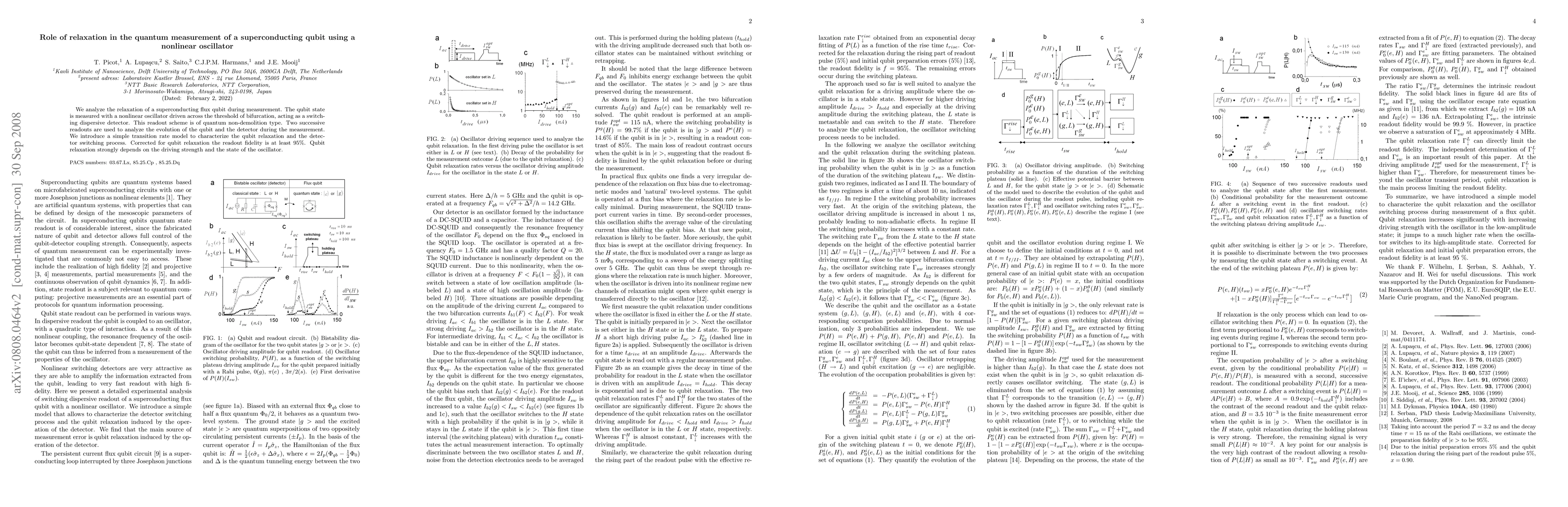 We analyze the relaxation of a superconducting flux qubit during measurement. The qubit state is measured with a nonlinear oscillator driven across the threshold of bifurcation, acting as a switching dispersive detector. This readout scheme is of quantum non-demolition type. Two successive readouts are used to analyze the evolution of the qubit and the detector during the measurement. We introduce a simple transition rate model to characterize the qubit relaxation and the detector switching process. Corrected for qubit relaxation the readout fidelity is at least 95%. Qubit relaxation strongly depends on the driving strength and the state of the oscillator.