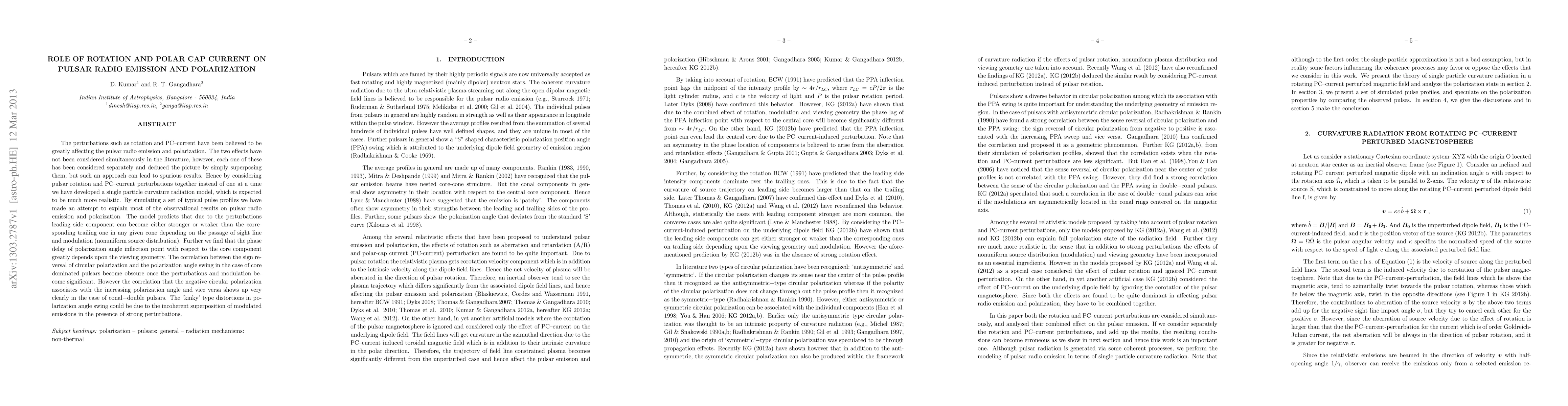 The perturbations such as rotation and PC--current have been believed to be greatly affecting the pulsar radio emission and polarization. The two effects have not been considered simultaneously in the literature, however, each one of these has been considered separately and deduced the picture by simply superposing them, but such an approach can lead to spurious results. Hence by considering pulsar rotation and PC--current perturbations together instead of one at a time we have developed a single particle curvature radiation model, which is expected to be much more realistic. By simulating a set of typical pulse profiles we have made an attempt to explain most of the observational results on pulsar radio emission and polarization. The model predicts that due to the perturbations leading side component can become either stronger or weaker than the corresponding trailing one in any given cone depending on the passage of sight line and modulation (nonuniform source distribution). Further we find that the phase delay of polarization angle inflection point with respect to the core component greatly depends upon the viewing geometry. The correlation between the sign reversal of circular polarization and the polarization angle swing in the case of core dominated pulsars become obscure once the perturbations and modulation become significant. However the correlation that the negative circular polarization associates with the increasing polarization angle and vice versa shows up very clearly in the case of conal-double pulsars. The `kinky' type distortions in polarization angle swing could be due to the incoherent superposition of modulated emissions in the presence of strong perturbations.
