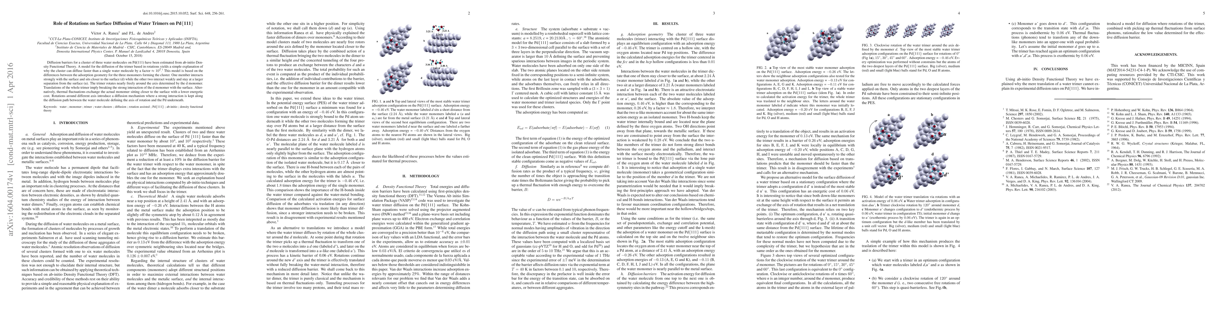 Diffusion barriers for a cluster of three water molecules on Pd(111) have been estimated from ab-initio Density Functional Theory. A model for the diffusion of the trimer based in rotations yields a simple explanation of why the cluster can diffuse faster than a single water molecule by a factor $\approx 10^{2}$. This model is based on the differences between the adsorption geometry for the three monomers forming the cluster. One member interacts strongly with the surface and sits closer to the surface (d) while the other two interact weakly and stay at a larger separation from the surface (u). The trimer rotates nearly freely around the axis determined by the d monomer. Translations of the whole trimer imply breaking the strong interaction of the d monomer with the surface. Alternatively, thermal fluctuations exchange the actual monomer sitting closer to the surface with a lower energetic cost. Rotations around different axis introduce a diffusion mechanism where a strong interaction is kept along the diffusion path between the water molecule defining the axis of rotation and the Pd underneath.
