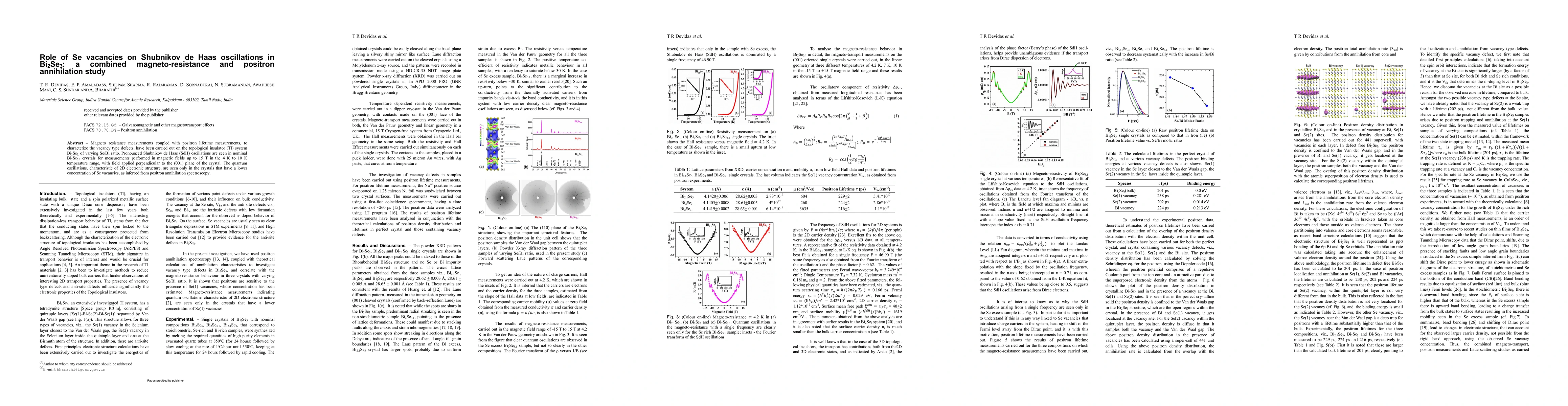 Magneto resistance measurements coupled with positron lifetime measurements, to characterize the vacancy type defects, have been carried out on the topological insulator (TI) system Bi2Se3, of varying Se/Bi ratio. Pronounced Shubnikov de Haas (SdH) oscillations are seen in nominal Bi2Se3.1 crystals for measurements performed in magnetic fields up to 15 T in the 4 K to 10 K temperature range, with field applied perpendicular to the (001) plane of the crystal. The quantum oscillations, characteristic of 2D electronic structure, are seen only in the crystals that have a lower concentration of Se vacancies, as inferred from positron annihilation spectroscopy.