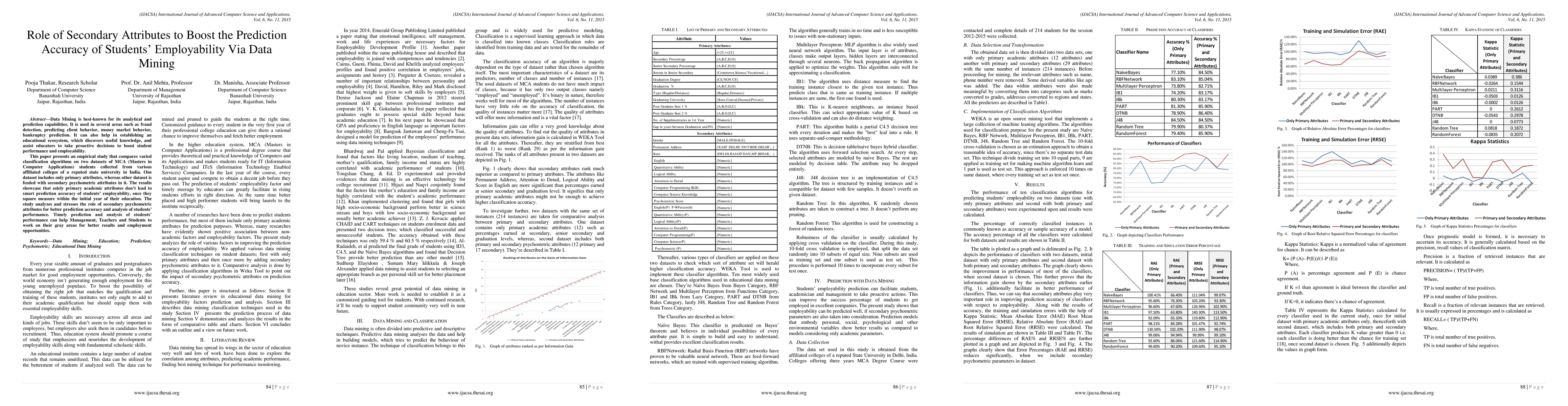 Data Mining is best-known for its analytical and prediction capabilities. It is used in several areas such as fraud detection, predicting client behavior, money market behavior, bankruptcy prediction. It can also help in establishing an educational ecosystem, which discovers useful knowledge, and assist educators to take proactive decisions to boost student performance and employability. This paper presents an empirical study that compares varied classification algorithms on two datasets of MCA (Masters in Computer Applications) students collected from various affiliated colleges of a reputed state university in India. One dataset includes only primary attributes, whereas other dataset is feeded with secondary psychometric attributes in it. The results showcase that solely primary academic attributes do not lead to smart prediction accuracy of students employability, once they square measure within the initial year of their education. The study analyzes and stresses the role of secondary psychometric attributes for better prediction accuracy and analysis of students performance. Timely prediction and analysis of students performance can help Management, Teachers and Students to work on their gray areas for better results and employment opportunities.