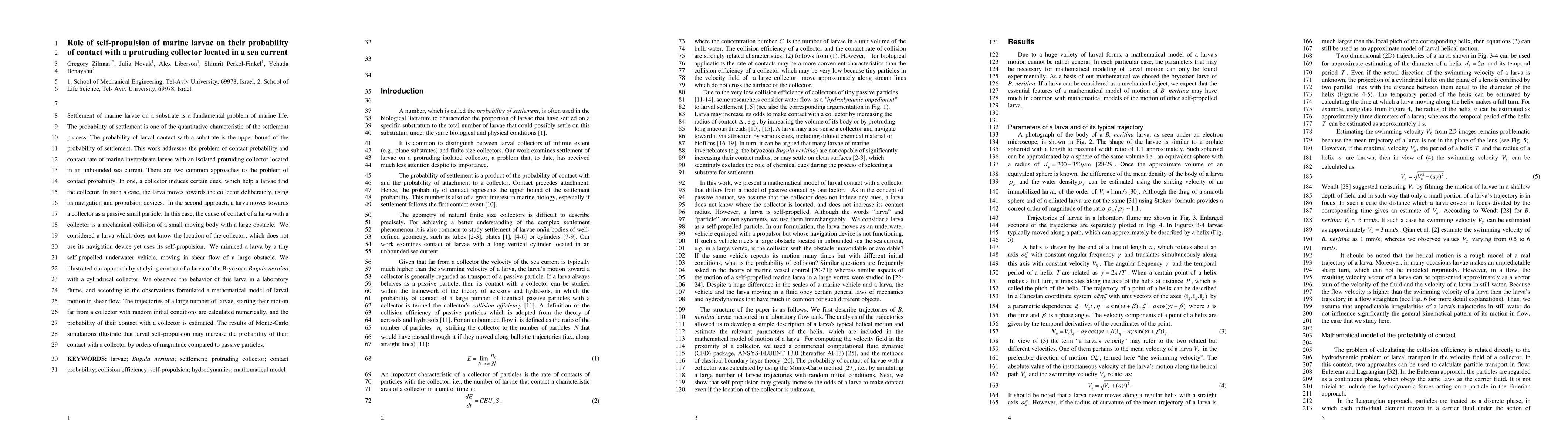 Settlement of marine larvae on a substrate is a fundamental problem of marine life. The probability of settlement is one of the quantitative characteristic of the settlement process. The probability of larval contact with a substrate is the upper bound of the probability of settlement. This work addresses the problem of contact probability and contact rate of marine invertebrate larvae with an isolated protruding collector located in an unbounded sea current. There are two common approaches to the problem of contact probability. In one, a collector induces certain cues, which help a larvae find the collector. In such a case, the larva moves towards the collector deliberately, using its navigation and propulsion devices. In the second approach, a larva moves towards a collector as a passive small particle. In this case, the cause of contact of a larva with a collector is a mechanical collision of a small moving body with a large obstacle. We considered a larva which does not know the location of the collector, which does not use its navigation device yet uses its self-propulsion. We mimicked a larva by a tiny self-propelled underwater vehicle, moving in shear flow of a large obstacle. We illustrated our approach by studying contact of a larva of the Bryozoan Bugula neritina with a cylindrical collector. We observed the behavior of this larva in a laboratory flume, and according to the observations formulated a mathematical model of larval motion in shear flow. The trajectories of a large number of larvae, starting their motion far from a collector with random initial conditions are calculated numerically, and the probability of their contact with a collector is estimated. The results of Monte-Carlo simulations illustrate that larval self-propulsion may increase the probability of their contact with a collector by orders of magnitude compared to passive particles.