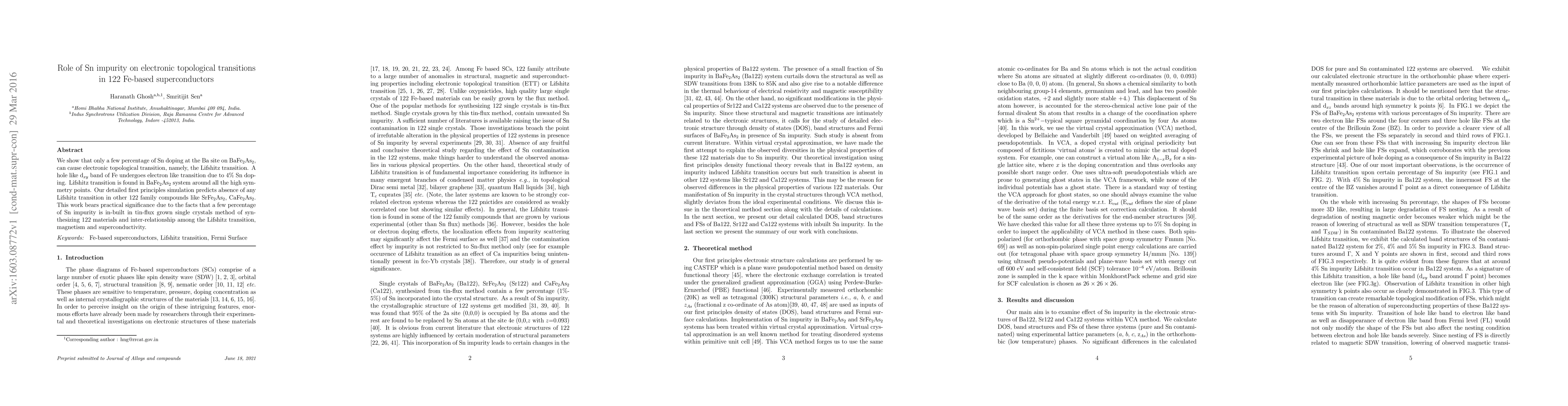 We show that only a few percentage of Sn doping at the Ba site on BaFe$_2$As$_2$, can cause electronic topological transition, namely, the Lifshitz transition. A hole like d$_{xy}$ band of Fe undergoes electron like transition due to 4\% Sn doping. Lifshitz transition is found in BaFe$_2$As$_2$ system around all the high symmetry points. Our detailed first principles simulation predicts absence of any Lifshitz transition in other 122 family compounds like SrFe$_2$As$_2$, CaFe$_2$As$_2$. This work bears practical significance due to the facts that a few percentage of Sn impurity is in-built in tin-flux grown single crystals method of synthesizing 122 materials and inter-relationship among the Lifshitz transition, magnetism and superconductivity.