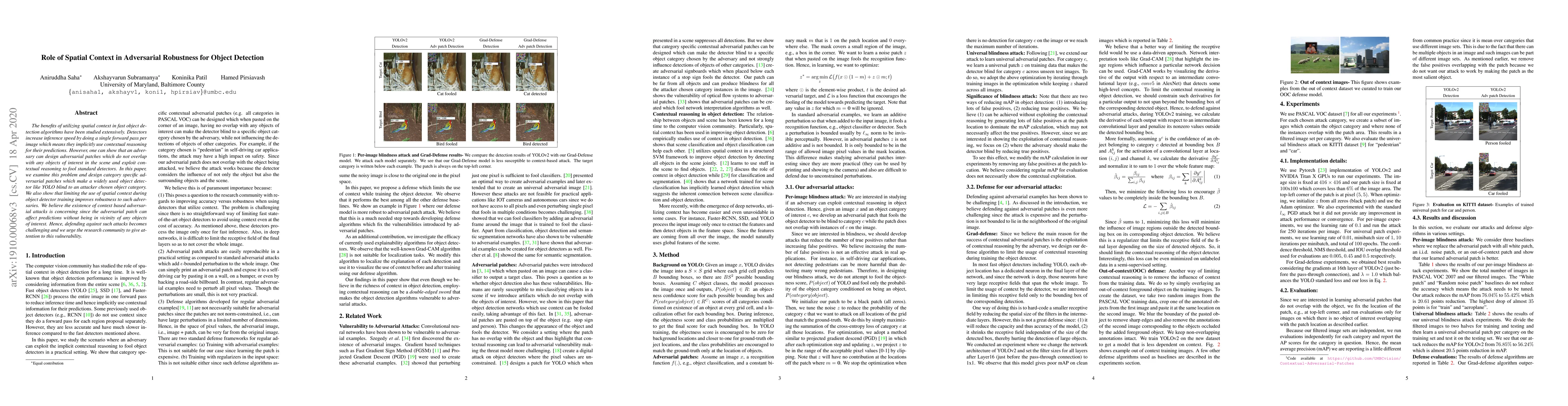The benefits of utilizing spatial context in fast object detection algorithms have been studied extensively. Detectors increase inference speed by doing a single forward pass per image which means they implicitly use contextual reasoning for their predictions. However, one can show that an adversary can design adversarial patches which do not overlap with any objects of interest in the scene and exploit contextual reasoning to fool standard detectors. In this paper, we examine this problem and design category specific adversarial patches which make a widely used object detector like YOLO blind to an attacker chosen object category. We also show that limiting the use of spatial context during object detector training improves robustness to such adversaries. We believe the existence of context based adversarial attacks is concerning since the adversarial patch can affect predictions without being in vicinity of any objects of interest. Hence, defending against such attacks becomes challenging and we urge the research community to give attention to this vulnerability.