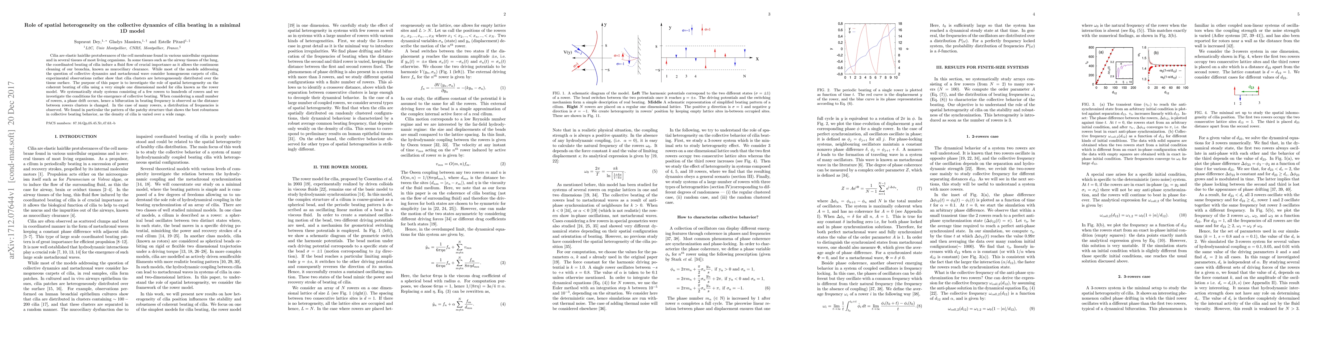 This paper explores how spatial heterogeneity affects the collective dynamics of cilia beating using a simple 1D rower model, finding that small clusters exhibit phase drift and frequency bifurcation, while larger clusters show a distribution of frequencies, with patchy structures demonstrating robust collective beating across varying densities.