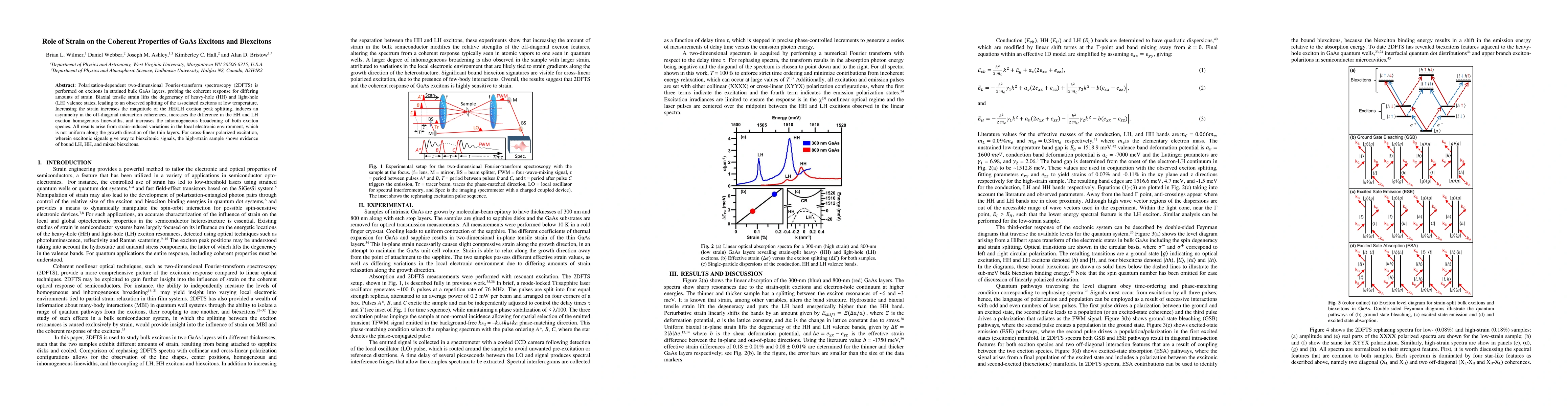 This research uses polarization-dependent 2DFTS to study strain's impact on GaAs excitons and biexcitons, finding that biaxial tensile strain lifts HH/LH valence states' degeneracy, increasing exciton peak splitting, coherence asymmetry, linewidth difference, and inhomogeneous broadening. High strain reveals bound LH, HH, and mixed biexcitons.