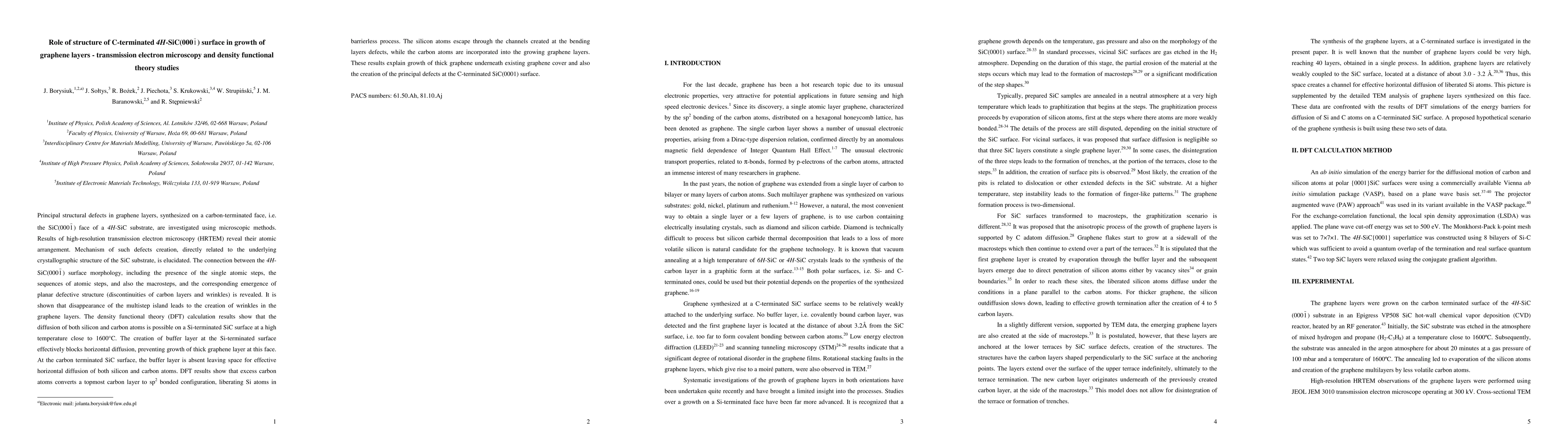 This paper investigates the structural defects in graphene layers grown on carbon-terminated 4H-SiC(000) using HRTEM and DFT. It reveals that the SiC surface morphology, including atomic steps, influences the formation of planar defects in graphene, with wrinkles emerging when multistep islands disappear. DFT calculations show that silicon and carbon diffusion is facilitated on carbon-terminated surfaces, leading to the growth of thick graphene layers.