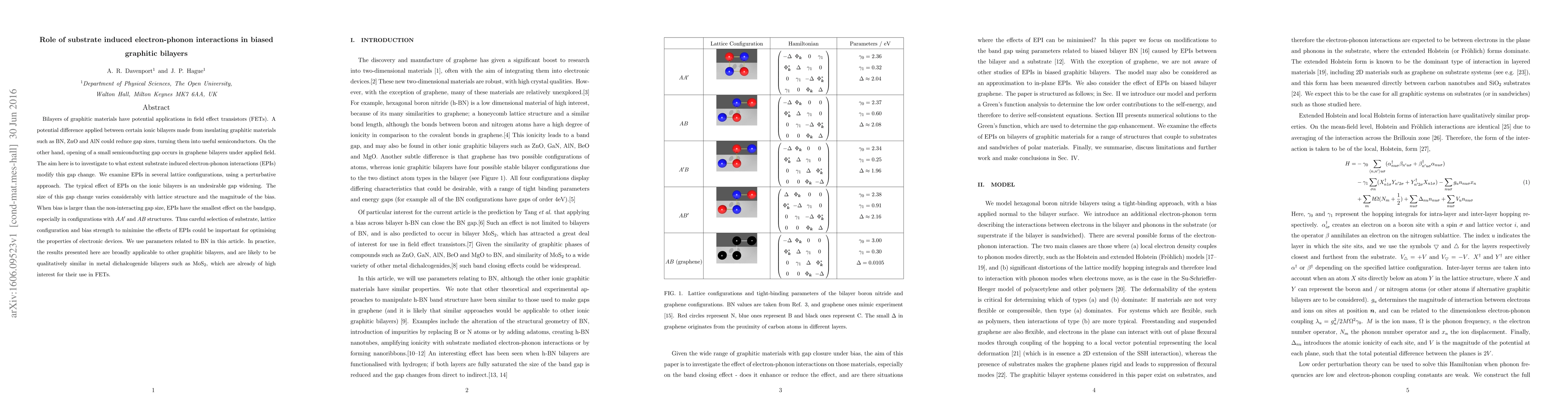 Bilayers of graphitic materials have potential applications in field effect transistors (FETs). A potential difference applied between certain ionic bilayers made from insulating graphitic materials such as BN, ZnO and AlN could reduce gap sizes, turning them into useful semiconductors. On the other hand, opening of a small semiconducting gap occurs in graphene bilayers under applied field. The aim here is to investigate to what extent substrate induced electron-phonon interactions (EPIs) modify this gap change. We examine EPIs in several lattice configurations, using a perturbative approach. The typical effect of EPIs on the ionic bilayers is an undesirable gap widening. The size of this gap change varies considerably with lattice structure and the magnitude of the bias. When bias is larger than the non-interacting gap size, EPIs have the smallest effect on the bandgap, especially in configurations with $AA^{\prime}$ and $AB$ structures. Thus careful selection of substrate, lattice configuration and bias strength to minimise the effects of EPIs could be important for optimising the properties of electronic devices. We use parameters related to BN in this article. In practice, the results presented here are broadly applicable to other graphitic bilayers, and are likely to be qualitatively similar in metal dichalcogenide bilayers such as MoS$_2$, which are already of high interest for their use in FETs.