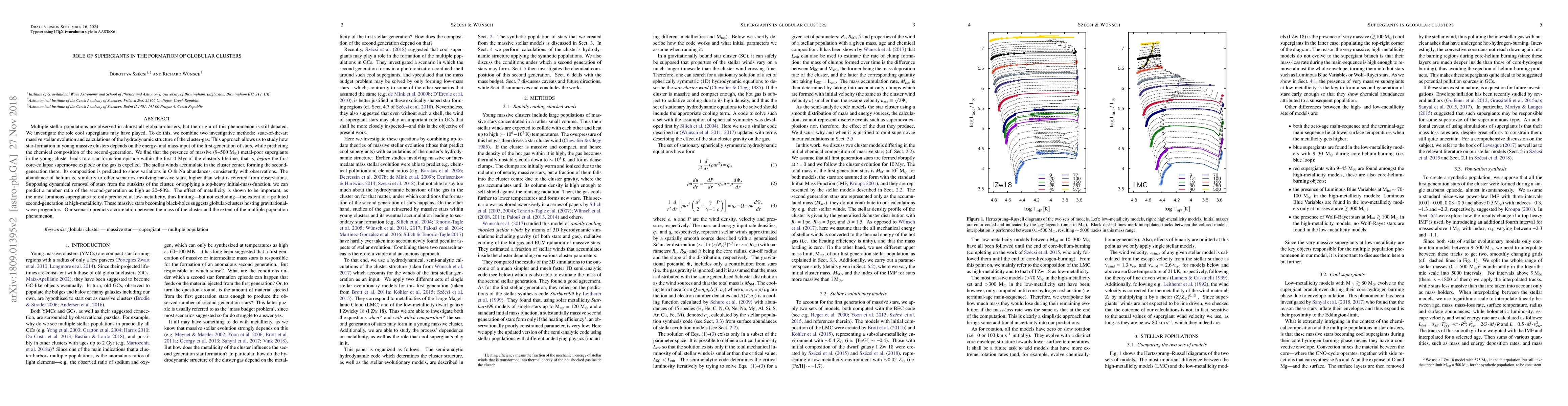 Multiple stellar populations are observed in almost all globular-clusters, but the origin of this phenomenon is still debated. We investigate the role cool supergiants may have played. To do this, we combine two investigative methods: state-of-the-art massive stellar evolution and calculations of the hydrodynamic structure of the cluster-gas. This approach allows us to study how star-formation in young massive clusters depends on the energy- and mass-input of the first-generation of stars, while predicting the chemical composition of the second-generation. We find that the presence of massive (9-500 M$_{\odot}$) metal-poor supergiants in the young cluster leads to a star-formation episode within the first 4 Myr of the cluster's lifetime, that is, before the first core-collapse supernovae explode or the gas is expelled. The stellar winds accumulate in the cluster center, forming the second-generation there. Its composition is predicted to show variations in O & Na abundances, consistently with observations. The abundance of helium is, similarly to other scenarios involving massive stars, higher than what is referred from observations. Supposing dynamical removal of stars from the outskirts of the cluster, or applying a top-heavy initial-mass-function, we can predict a number ratio of the second-generation as high as 20-80%. The effect of metallicity is shown to be important, as the most luminous supergiants are only predicted at low-metallicity, thus limiting $-$ but not excluding $-$ the extent of a polluted second-generation at high-metallicity. These massive stars becoming black-holes suggests globular-clusters hosting gravitational-wave progenitors. Our scenario predicts a correlation between the mass of the cluster and the extent of the multiple population phenomenon.