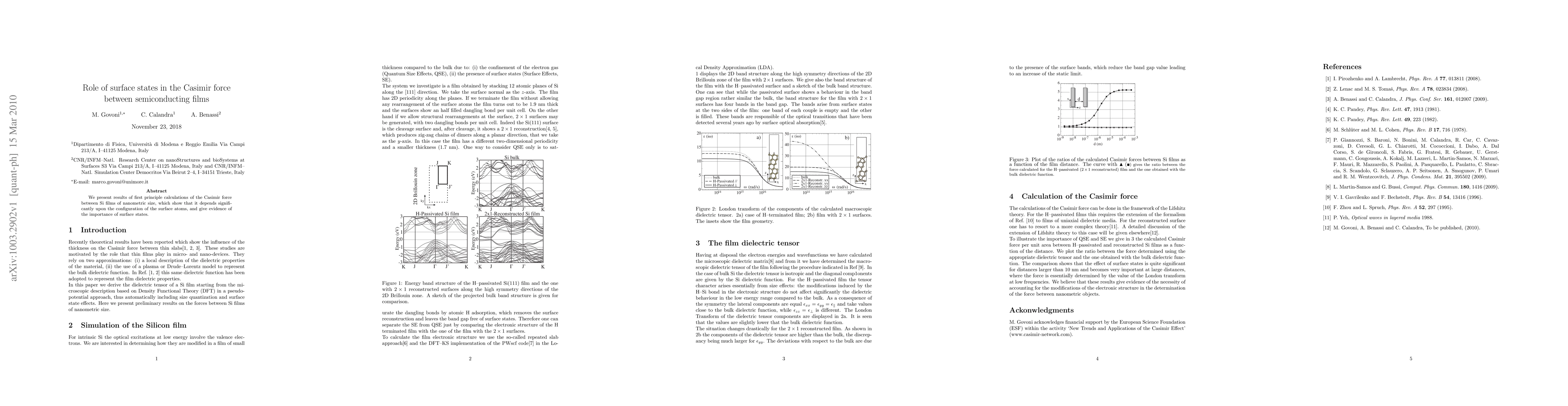 We present results of first principle calculations of the Casimir force between Si films of nanometric size, which show that it depends significantly upon the configuration of the surface atoms, and give evidence of the importance of surface states.