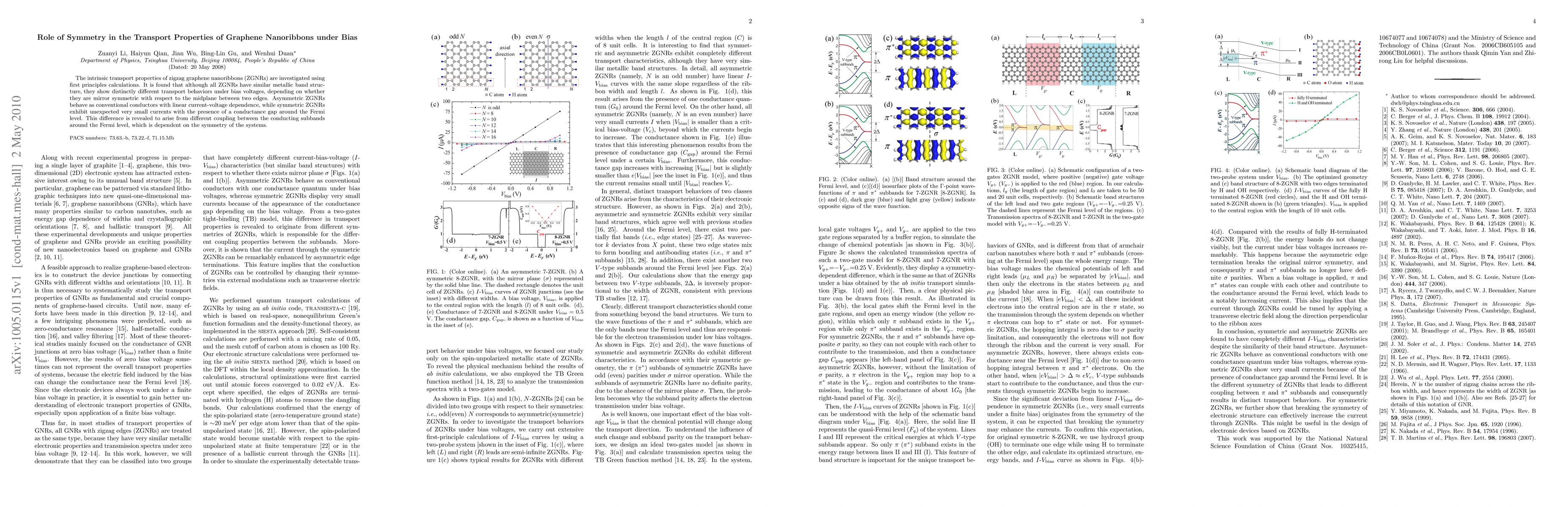 The intrinsic transport properties of zigzag graphene nanoribbons (ZGNRs) are investigated using first principles calculations. It is found that although all ZGNRs have similar metallic band structure, they show distinctly different transport behaviors under bias voltages, depending on whether they are mirror symmetric with respect to the midplane between two edges. Asymmetric ZGNRs behave as conventional conductors with linear current-voltage dependence, while symmetric ZGNRs exhibit unexpected very small currents with the presence of a conductance gap around the Fermi level. This difference is revealed to arise from different coupling between the conducting subbands around the Fermi level, which is dependent on the symmetry of the systems.