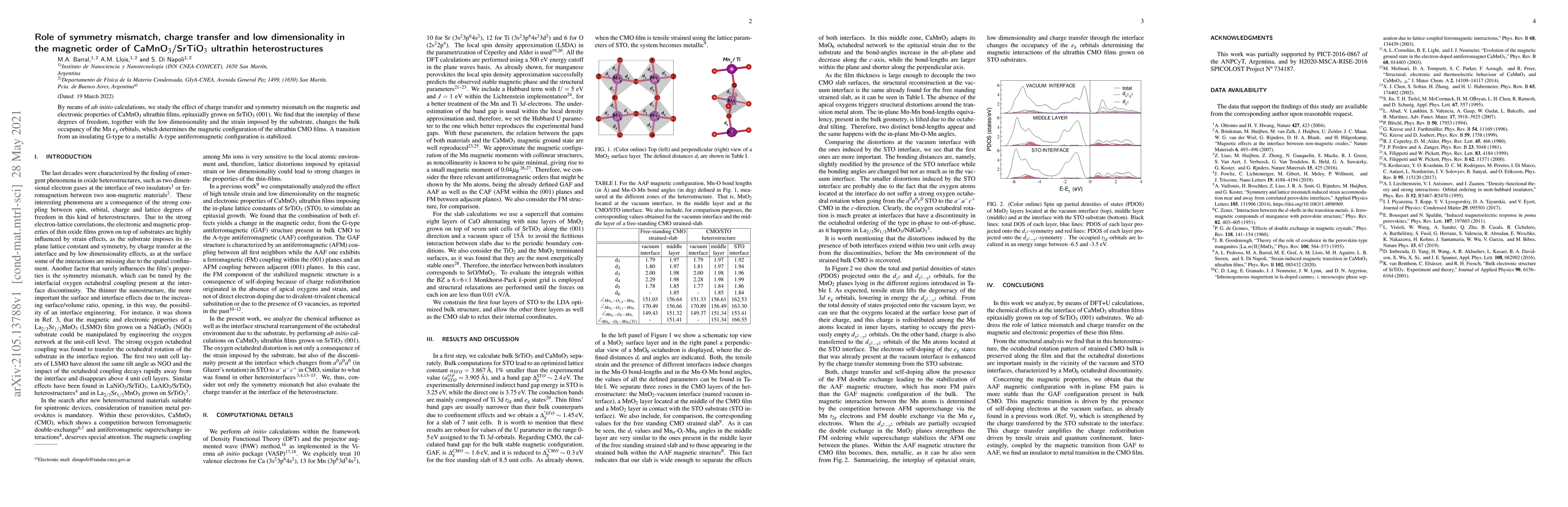 By means of ab initio calculations, we study the effect of charge transfer and symmetry mismatch on the magnetic and electronic properties of CaMnO$_3$ ultrathin films, epitaxially grown on SrTiO$_3$ (001). We find that the interplay of these degrees of freedom, together with the low dimensionality and the strain imposed by the substrate, changes the bulk occupancy of the Mn e_$g$ orbitals, which determines the magnetic configuration of the ultrathin CMO films. A transition from an insulating G-type to a metallic A-type antiferromagnetic configuration is stabilized.