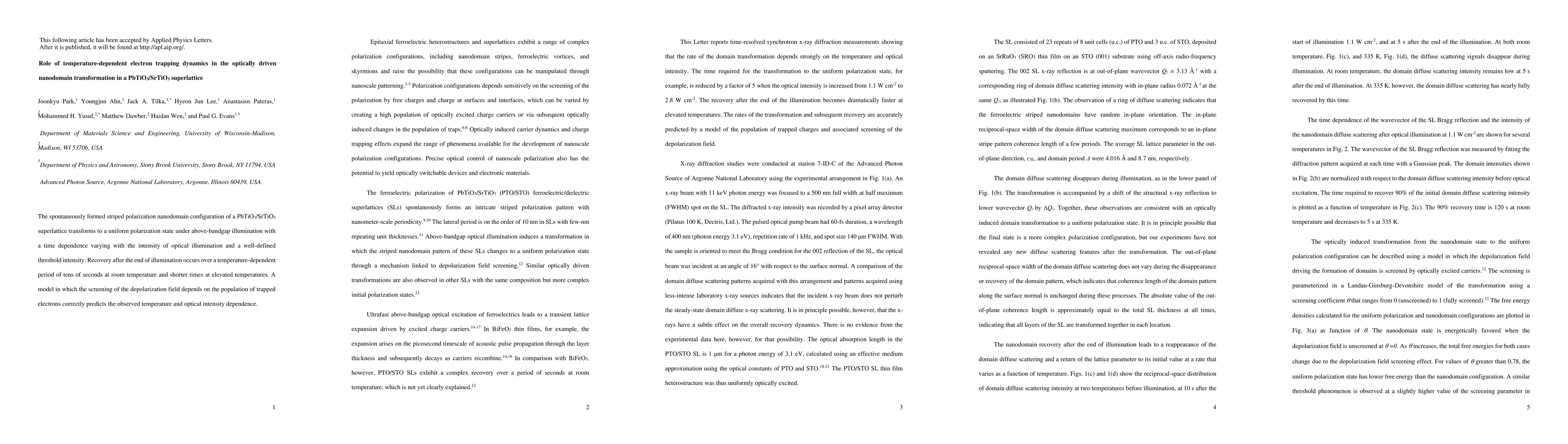 The spontaneously formed striped polarization nanodomain configuration of a PbTiO${_3}$/SrTiO${_3}$ superlattice transforms to a uniform polarization state under above-bandgap illumination with a time dependence varying with the intensity of optical illumination and a well-defined threshold intensity. Recovery after the end of illumination occurs over a temperature-dependent period of tens of seconds at room temperature and shorter times at elevated temperatures. A model in which the screening of the depolarization field depends on the population of trapped electrons correctly predicts the observed temperature and optical intensity dependence.