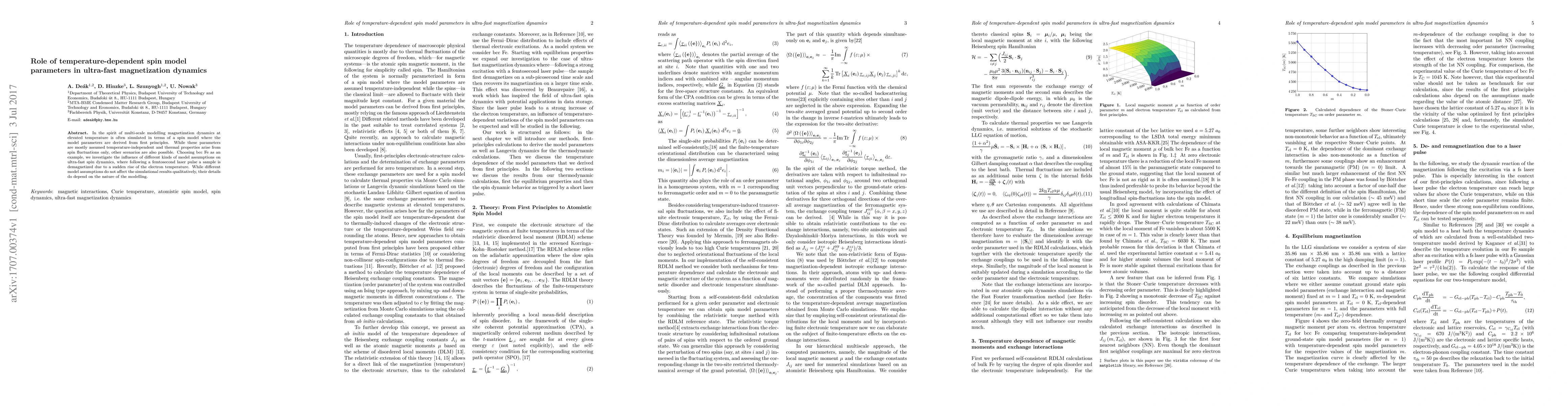 In the spirit of multi-scale modelling magnetization dynamics at elevated temperature is often simulated in terms of a spin model where the model parameters are derived from first principles. While these parameters are mostly assumed temperature-independent and thermal properties arise from spin fluctuations only, other scenarios are also possible. Choosing bcc Fe as an example, we investigate the influence of different kinds of model assumptions on ultra-fast spin dynamics, where following a femtosecond laser pulse a sample is demagnetized due to a sudden rise of the electron temperature. While different model assumptions do not affect the simulational results qualitatively, their details do depend on the nature of the modelling.