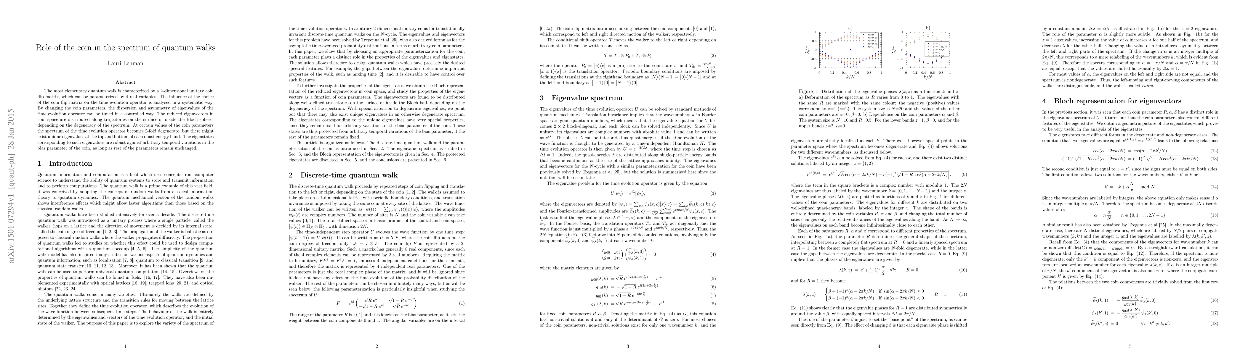 The most elementary quantum walk is characterized by a 2-dimensional unitary coin flip matrix, which can be parameterized by 4 real variables. The influence of the choice of the coin flip matrix on the time evolution operator is analysed in a systematic way. By changing the coin parameters, the dispersion and asymmetry of eigenvalues of the time evolution operator can be tuned in a controlled way. The reduced eigenvectors in coin space are distributed along trajectories on the surface or inside the Bloch sphere, depending on the degeneracy of the spectrum. At certain values of the coin parameters the spectrum of the time evolution operator becomes 2-fold degenerate, but there might exist unique eigenvalues at the top and bottom of each quasi-energy band. The eigenstates corresponding to such eigenvalues are robust against arbitrary temporal variations in the bias parameter of the coin, as long as rest of the parameters remain unchanged.