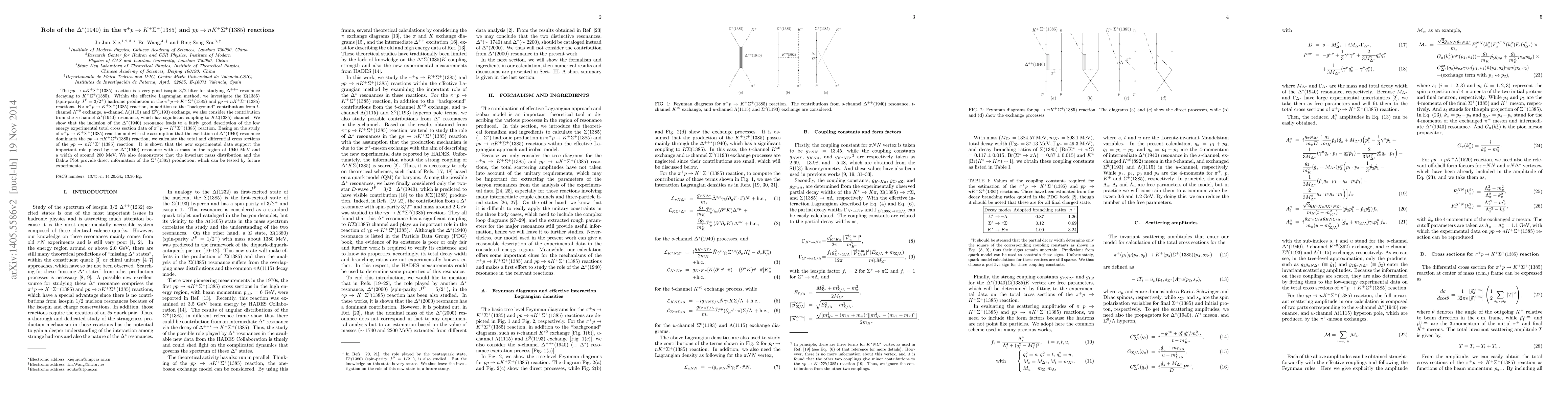 The $p p \to n K^+ \Sigma^+(1385)$ reaction is a very good isospin $3/2$ filter for studying $\Delta^{++*}$ resonance decaying to $K^+\Sigma^+(1385)$. Within the effective Lagrangian method, we investigate the $\Sigma(1385)$ (spin-parity $J^P = 3/2^+$) hadronic production in the $\pi^+ p \to K^+ \Sigma^+(1385)$ and $p p \to n K^+ \Sigma^+(1385)$ reactions. For $\pi^+ p \to K^+ \Sigma^+(1385)$ reaction, in addition to the "background" contributions from $t$-channel $K^{*0}$ exchange, $u$-channel $\Lambda(1115)$ and $\Sigma^0(1193)$ exchange, we also consider the contribution from the $s$-channel $\Delta^*(1940)$ resonance, which has significant coupling to $K\Sigma(1385)$ channel. We show that the inclusion of the $\Delta^*(1940)$ resonance leads to a fairly good description of the low energy experimental total cross section data of $\pi^+ p \to K^+ \Sigma^+(1385)$ reaction. Basing on the study of $\pi^+ p \to K^+\Sigma^+(1385)$ reaction and with the assumption that the excitation of $\Delta^*(1940)$ resonance dominant the $pp \to n K^+ \Sigma^+(1385)$ reaction, we calculate the total and differential cross sections of $p p \to n K^+ \Sigma^+(1385)$ reaction. It is shown that the new experimental data support the important role played by the $\Delta^*(1940)$ resonance with a mass in the region of $1940$ MeV and a width of around $200$ MeV. We also demonstrate that the invariant mass distribution and the Dalitz Plot provide direct information of the $\Sigma^+(1385)$ production, which can be tested by future experiments.