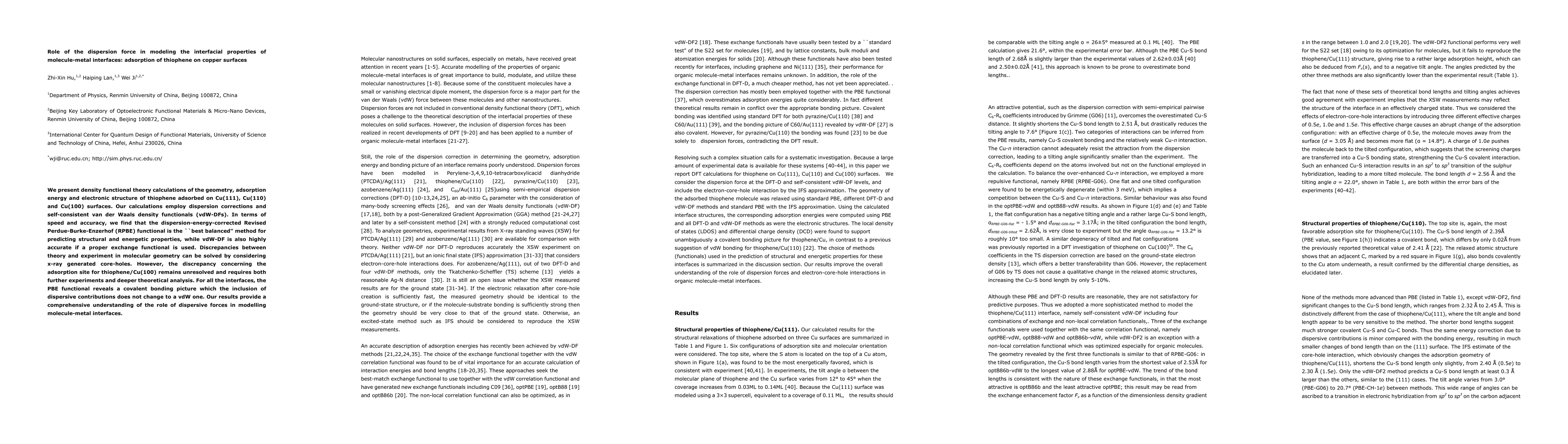 We present density functional theory calculations of the geometry, adsorption energy and electronic structure of thiophene adsorbed on Cu(111), Cu(110) and Cu(100) surfaces. Our calculations employ dispersion corrections and self-consistent van der Waals density functionals (vdW-DFs). In terms of speed and accuracy, we find that the dispersion-energy-corrected Revised Perdue-Burke-Enzerhof (RPBE) functional is the "best balanced" method for predicting structural and energetic properties, while vdW-DF is also highly accurate if a proper exchange functional is used. Discrepancies between theory and experiment in molecular geometry can be solved by considering x-ray generated core-holes. However, the discrepancy concerning the adsorption site for thiophene/Cu(100) remains unresolved and requires both further experiments and deeper theoretical analysis. For all the interfaces, the PBE functional reveals a covalent bonding picture which the inclusion of dispersive contributions does not change to a vdW one. Our results provide a comprehensive understanding of the role of dispersive forces in modelling molecule-metal interfaces.