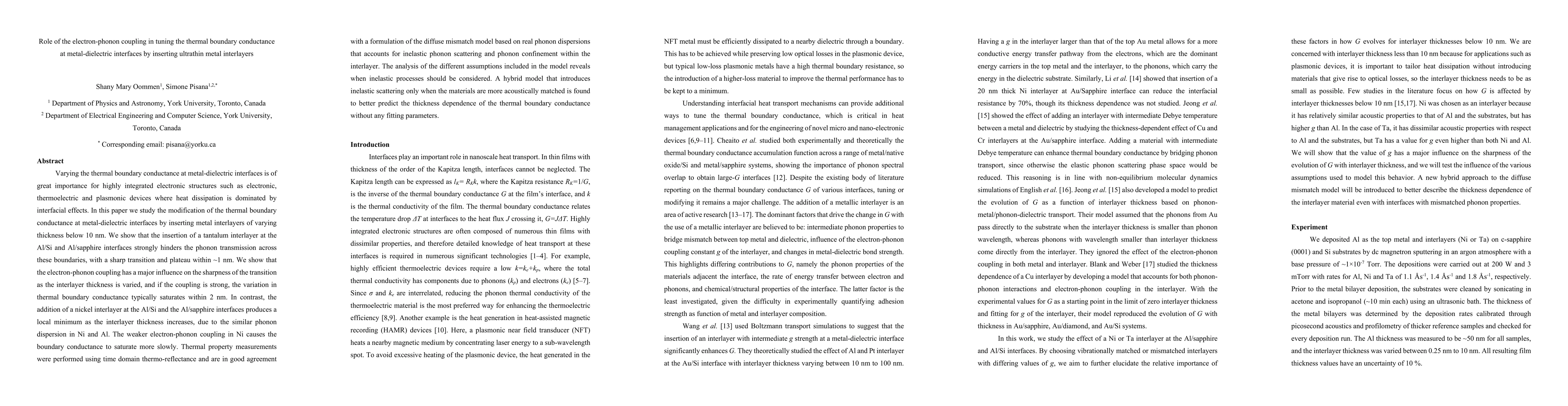 This paper investigates how ultrathin metal interlayers affect thermal boundary conductance at metal-dielectric interfaces, finding that tantalum interlayers significantly hinder phonon transmission due to strong electron-phonon coupling, while nickel interlayers show a slower saturation due to weaker coupling. The study uses time domain thermo-reflectance and a hybrid model to predict thermal conductance variations.