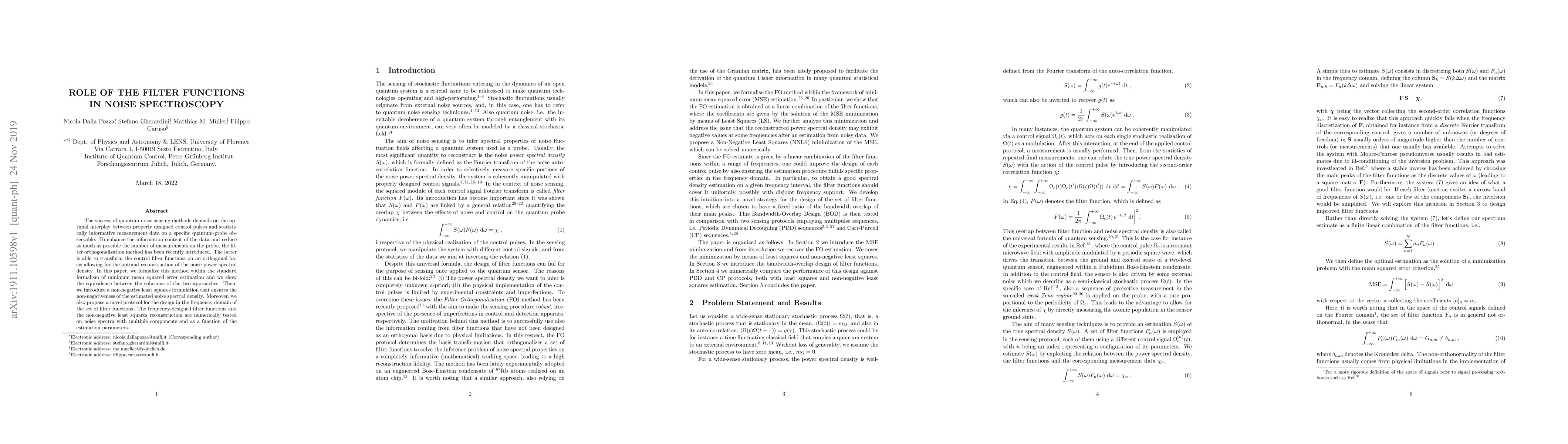 This paper formalizes the filter orthogonalization method for quantum noise spectroscopy, demonstrating its equivalence to minimum mean squared error estimation and introducing a non-negative least squares formulation for noise spectral density reconstruction. A novel protocol for designing filter functions in the frequency domain is also proposed and tested numerically.