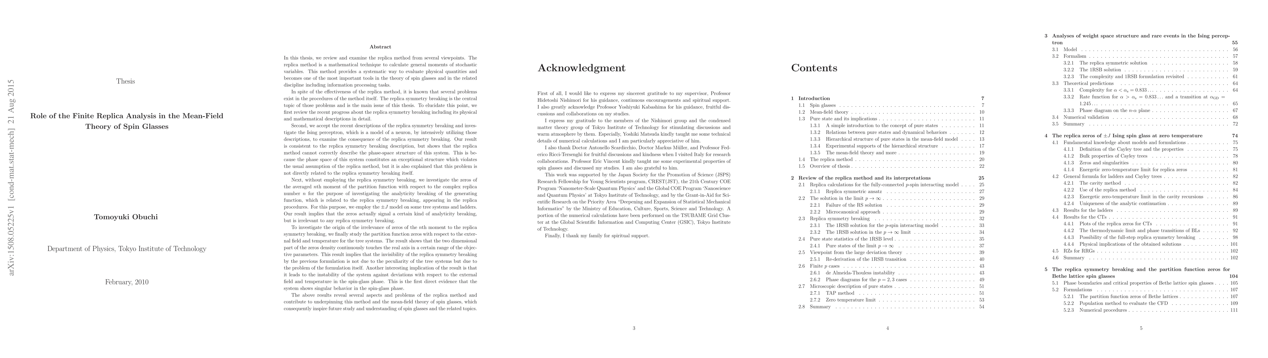 In this thesis, we review and examine the replica method from several viewpoints. The replica method is a mathematical technique to calculate general moments of stochastic variables. This method provides a systematic way to evaluate physical quantities and becomes one of the most important tools in the theory of spin glasses and in the related discipline including information processing tasks. In spite of the effectiveness of the replica method, it is known that several problems exist in the procedures of the method itself. The replica symmetry breaking is the central topic of those problems and is the main issue of this thesis. To elucidate this point, we review the recent progress about the replica symmetry breaking including its physical and mathematical descriptions in detail. Based on those descriptions, several spin-glass models and Ising perceptron are deeply investigated.