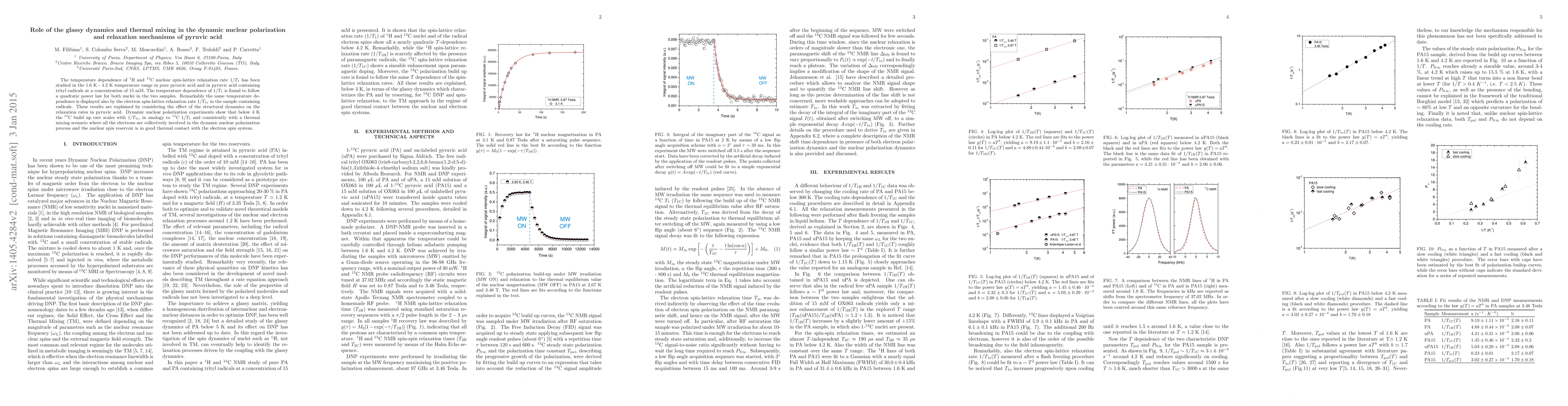The temperature dependence of $^1$H and $^{13}$C nuclear spin-lattice relaxation rate $1/T_1$ has been studied in the 1.6 K - 4.2 K temperature range in pure pyruvic acid and in pyruvic acid containing trityl radicals at a concentration of 15 mM. The temperature dependence of $1/T_1$ is found to follow a quadratic power law for both nuclei in the two samples. Remarkably the same temperature dependence is displayed also by the electron spin-lattice relaxation rate $1/T_{1e}$ in the sample containing radicals. These results are explained by considering the effect of the structural dynamics on the relaxation rates in pyruvic acid. Dynamic nuclear polarization experiments show that below 4 K the $^{13}$C build up rate scales with $1/T_{\text{1e}}$, in analogy to $^{13}$C $1/T_1$ and consistently with a thermal mixing scenario where all the electrons are collectively involved in the dynamic nuclear polarization process and the nuclear spin reservoir is in good thermal contact with the electron spin system.