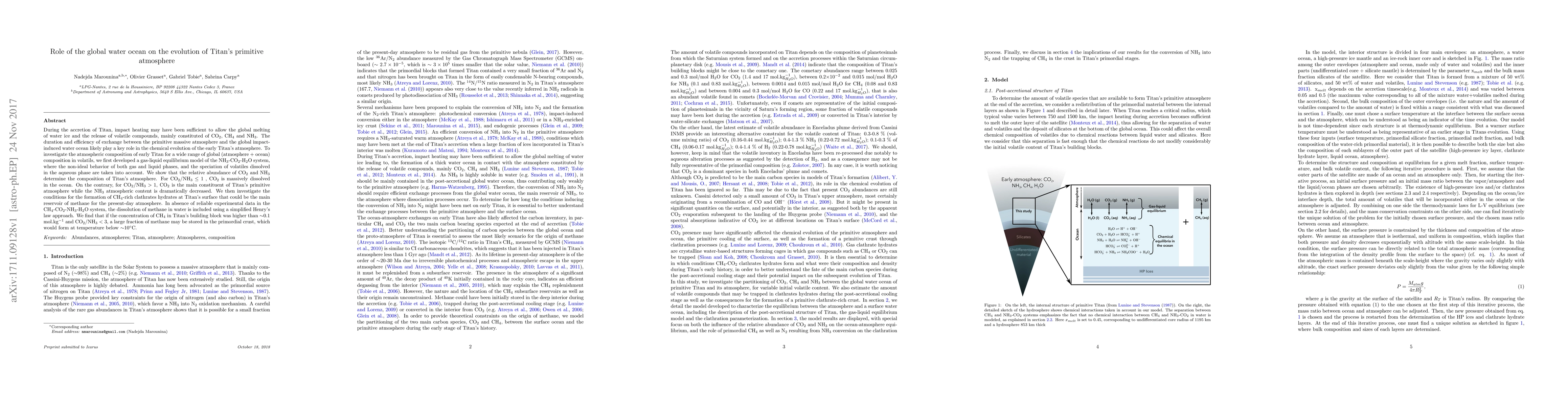 This research explores how Titan's early atmosphere evolved through interactions with a global water ocean formed by impact heating during its accretion. The study develops a gas-liquid equilibrium model to determine how the relative abundances of CO2 and NH3 influence Titan's atmospheric composition, with implications for methane storage in clathrates.