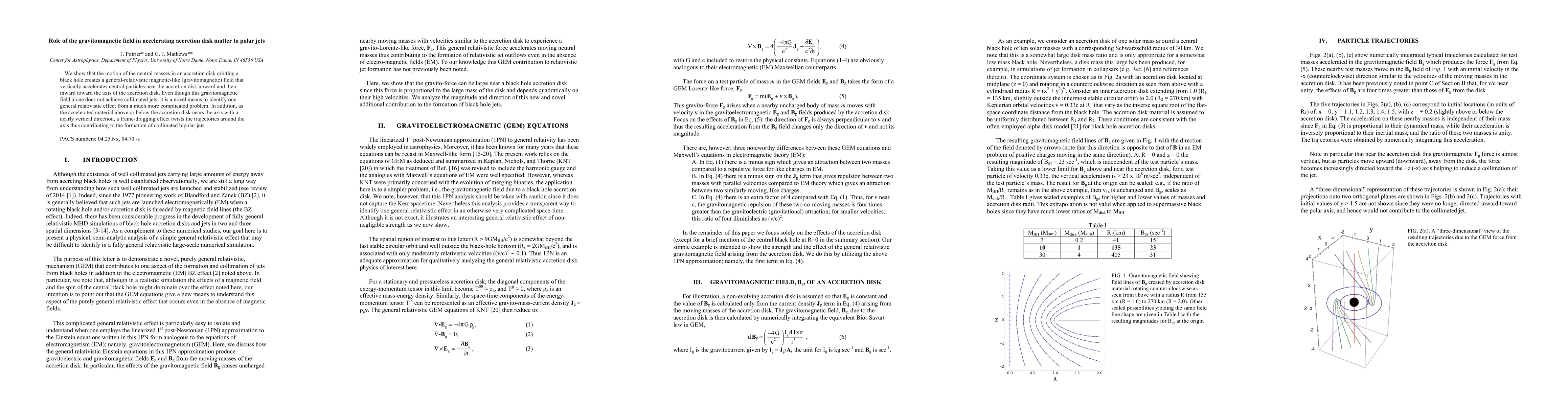 We show that the motion of the neutral masses in an accretion disk orbiting a black hole creates a general-relativistic magnetic-like (gravitomagnetic) field that vertically accelerates neutral particles near the accretion disk upward and then inward toward the axis of the accretion disk. Even though this gravitomagnetic field alone does not achieve collimated jets, it is a novel means to identify one general relativistic effect from a much more complicated problem. In addition, as the accelerated material above or below the accretion disk nears the axis with a nearly vertical direction, a frame-dragging effect twists the trajectories around the axis thus contributing to the formation of collimated bipolar jets.