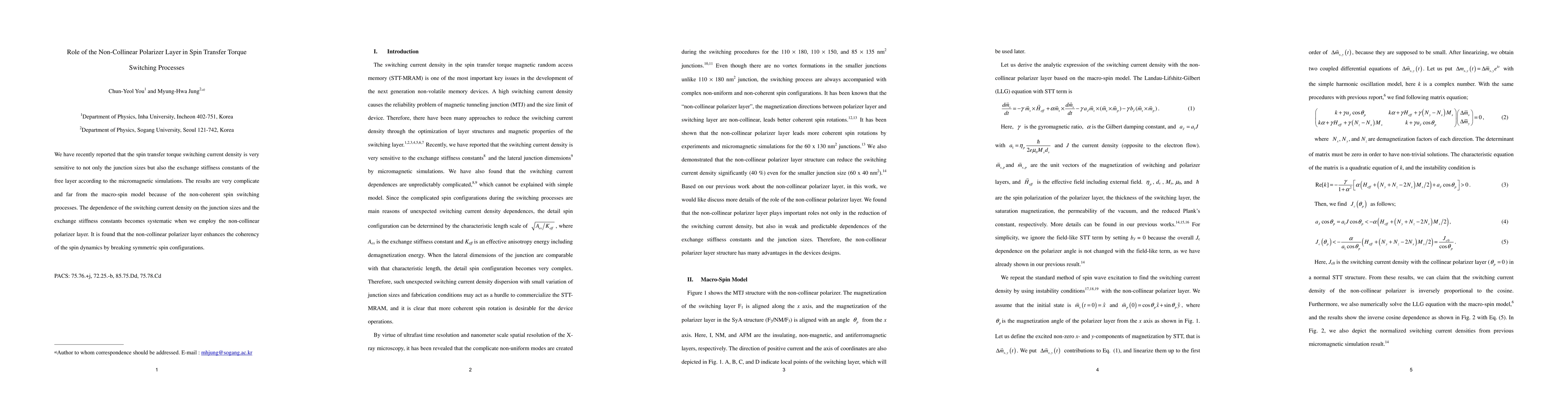 The non-collinear polarizer layer enhances spin dynamics by breaking symmetric configurations, leading to systematic dependence of switching current density on junction sizes and exchange stiffness constants.