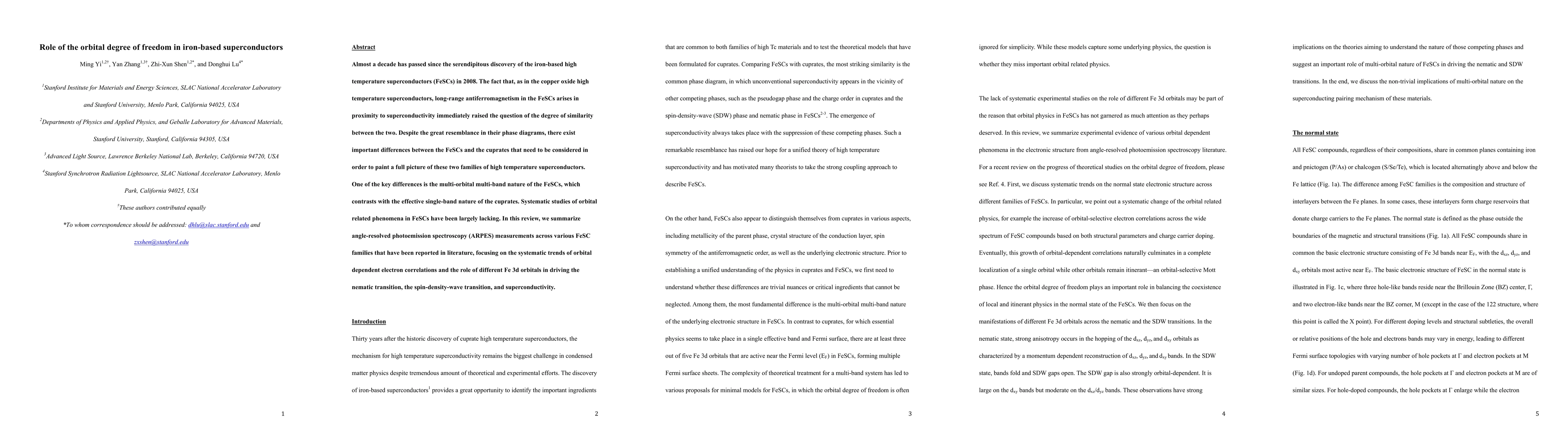 This review investigates the significance of the orbital degree of freedom in iron-based superconductors (FeSCs), highlighting ARPES studies that reveal orbital-dependent electron correlations and the role of Fe 3d orbitals in driving transitions like nematicity and spin-density waves, contrasting with the simpler single-band models of cuprate superconductors.