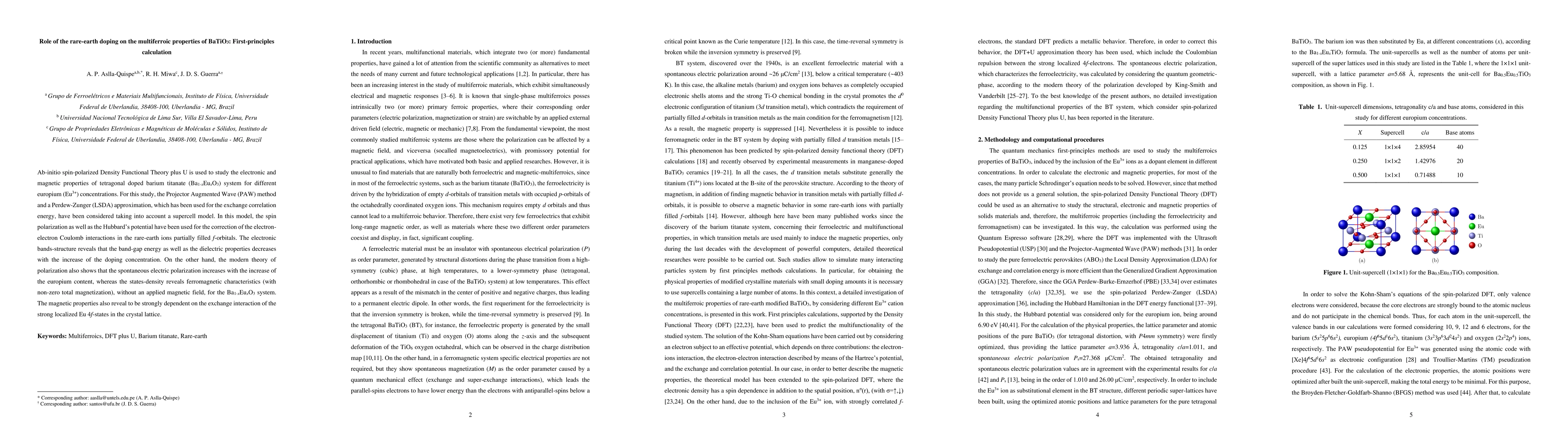 Ab-initio spin-polarized Density Functional Theory plus U is used to study the electronic and magnetic properties of tetragonal doped barium titanate (Ba$_{1-x}$Eu$_x$O$_3$) system for different europium (Eu$^{3+}$) concentrations. For this study, the Projector Augmented Wave (PAW) method and a Perdew-Zunger (LSDA) approximation, which has been used for the exchange correlation energy, have been considered taking into account a supercell model. In this model, the spin polarization as well as the Hubbard's potential have been used for the correction of the electron-electron Coulomb interactions in the rare-earth ions partially filled f-orbitals. The electronic bands-structure reveals that the band-gap energy as well as the dielectric properties decreases with the increase of the doping concentration. On the other hand, the modern theory of polarization also shows that the spontaneous electric polarization increases with the increase of the europium content, whereas the states-density reveals ferromagnetic characteristics (with non-zero total magnetization), without an applied magnetic field, for the Ba$_{1-x}$Eu$_x$O$_3$ system. The magnetic properties also reveal to be strongly dependent on the exchange interaction of the strong localized Eu 4f-states in the crystal lattice.