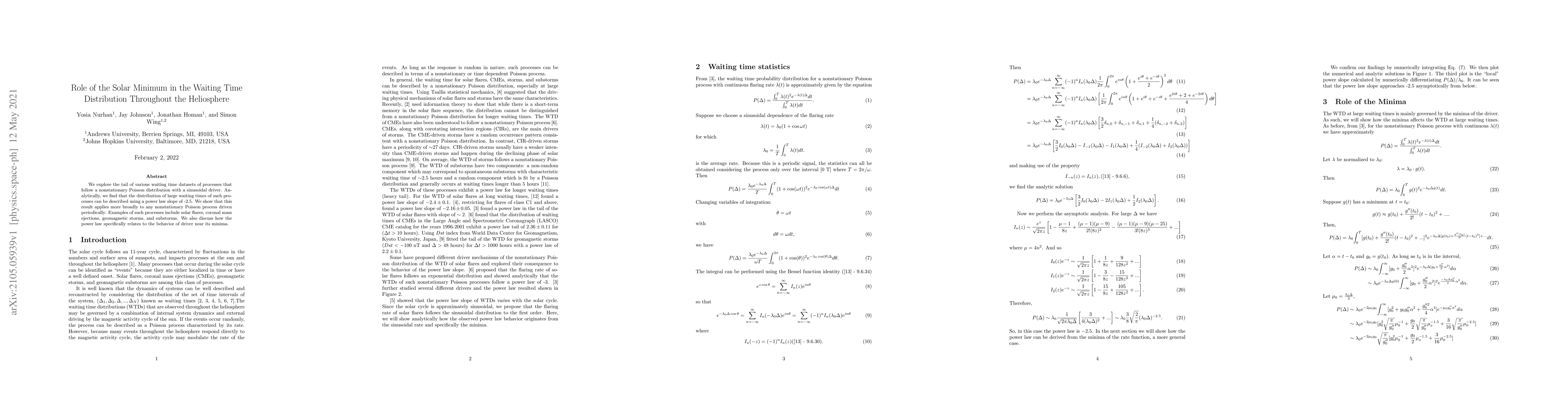 We explore the tail of various waiting time datasets of processes that follow a nonstationary Poisson distribution with a sinusoidal driver. Analytically, we find that the distribution of large waiting times of such processes can be described using a power law slope of -2.5. We show that this result applies more broadly to any nonstationary Poisson process driven periodically. Examples of such processes include solar flares, coronal mass ejections, geomagnetic storms, and substorms. We also discuss how the power law specifically relates to the behavior of driver near its minima.