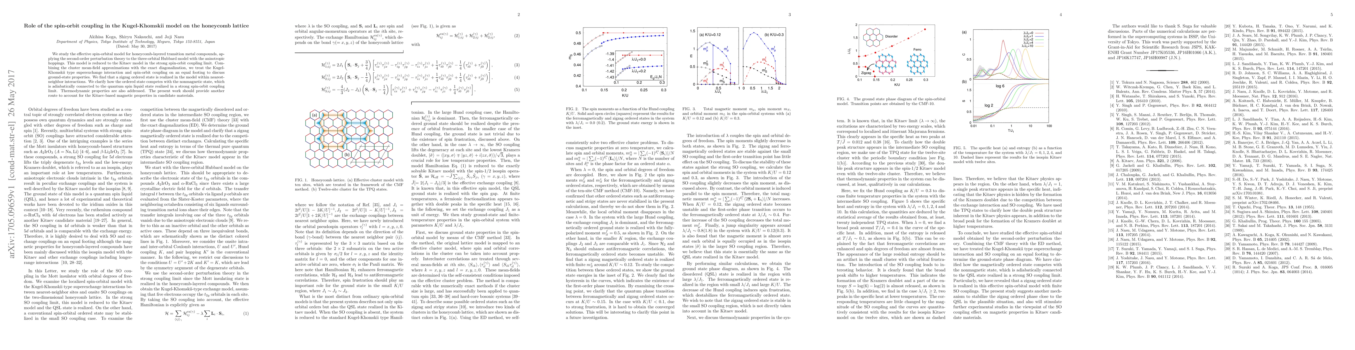 We study the effective spin-orbital model for honeycomb-layered transition metal compounds, applying the second-order perturbation theory to the three-orbital Hubbard model with the anisotropic hoppings. This model is reduced to the Kitaev model in the strong spin-orbit coupling limit. Combining the cluster mean-field approximations with the exact diagonalization, we treat the Kugel-Khomskii type superexchange interaction and spin-orbit coupling on an equal footing to discuss ground-state properties. We find that a zigzag ordered state is realized in the model within nearest-neighbor interactions. We clarify how the ordered state competes with the nonmagnetic state, which is adiabatically connected to the quantum spin liquid state realized in a strong spin-orbit coupling limit. Thermodynamic properties are also addressed. The present work should provide another route to account for the Kitaev-based magnetic properties in candidate materials.