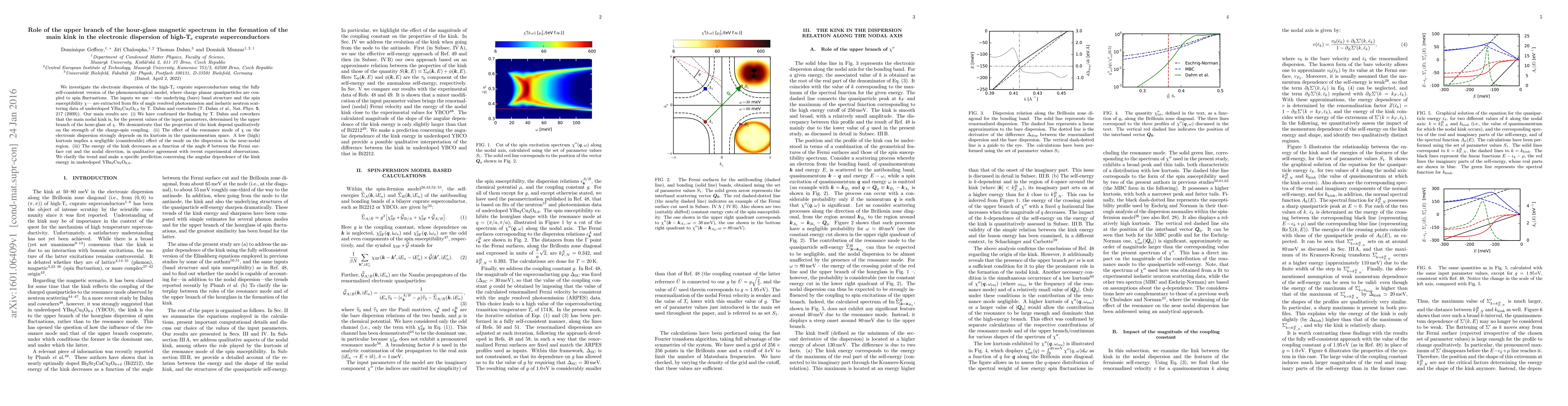 This paper investigates the role of the upper branch of the hour-glass magnetic spectrum in shaping the main kink in the electronic dispersion of high-T$_c$ cuprate superconductors. It confirms that the main nodal kink is determined by this magnetic spectrum and shows that its properties depend on the strength of charge-spin coupling.