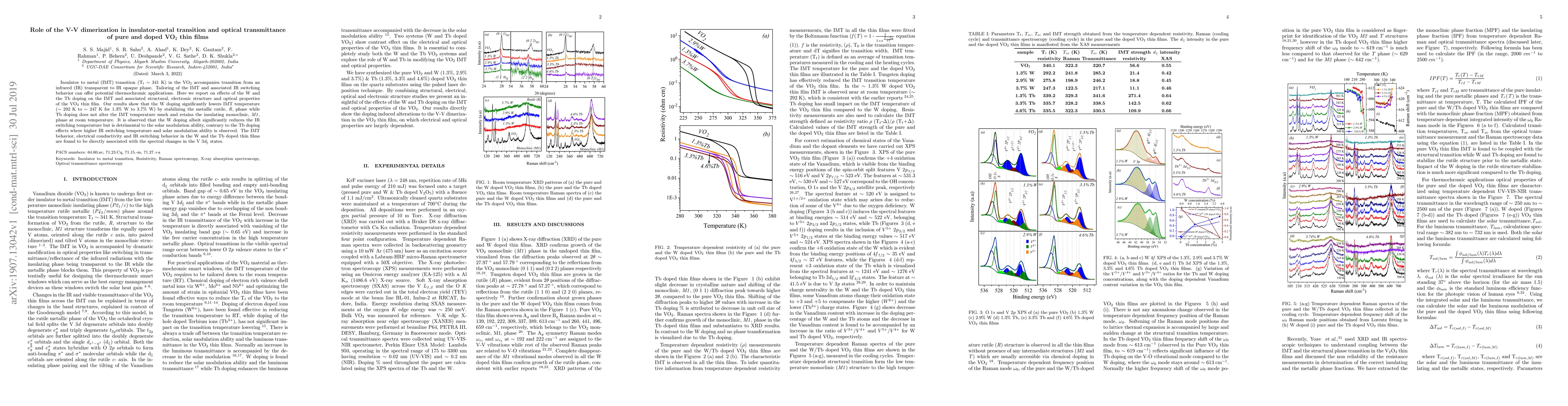 This paper investigates the impact of W and Tb doping on the insulator-metal transition (IMT) and optical properties of VO2 thin films, revealing that W doping lowers the IMT temperature but reduces IR switching efficiency, while Tb doping maintains the transition temperature but enhances IR switching and solar modulation.