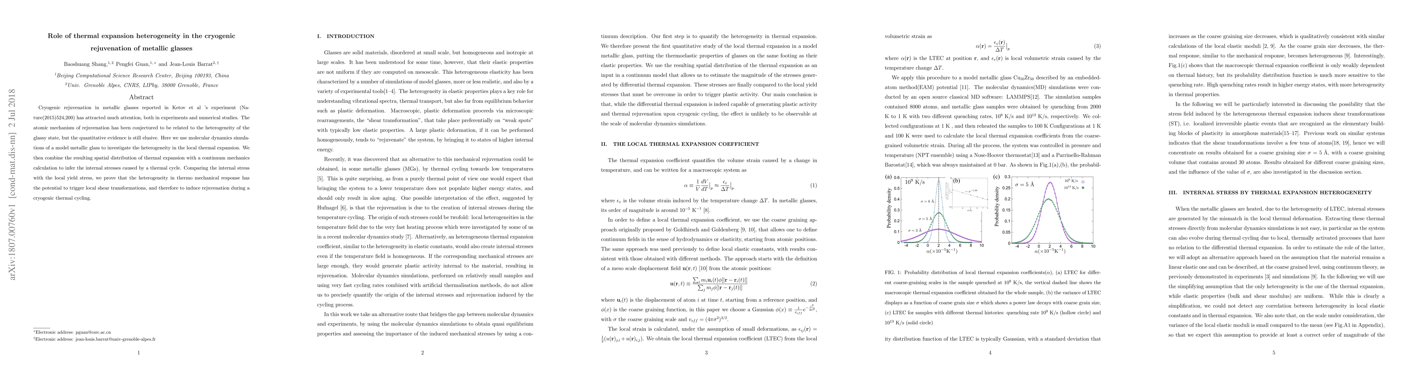 This study uses molecular dynamics simulations to investigate the heterogeneity in local thermal expansion in metallic glasses, demonstrating that the resulting internal stresses can exceed local yield stresses, triggering shear transformations and contributing to cryogenic rejuvenation. The findings provide quantitative evidence linking thermal expansion heterogeneity to rejuvenation mechanisms.
