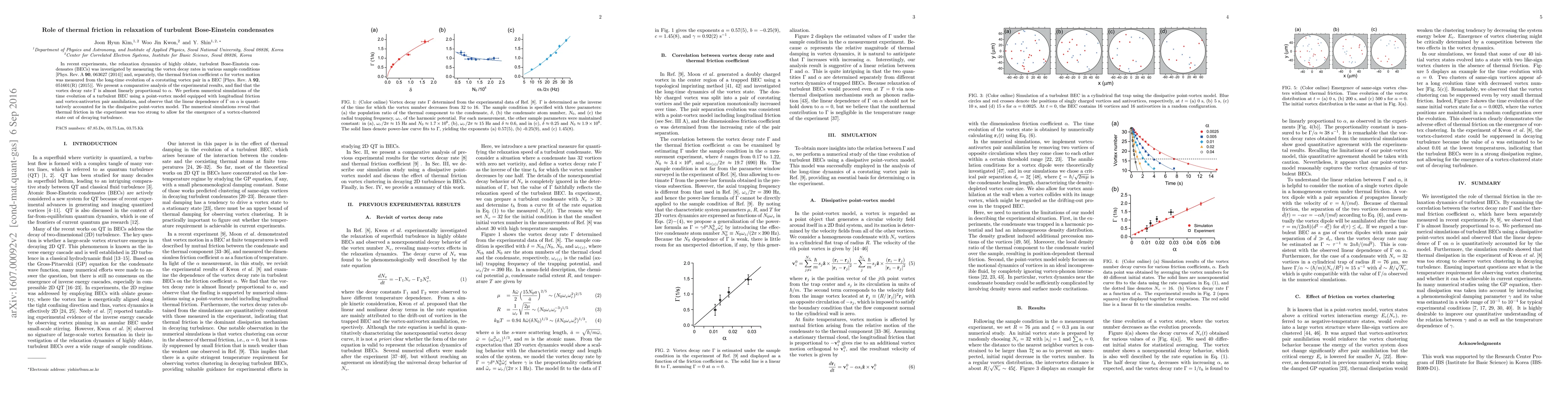 In recent experiments, the relaxation dynamics of highly oblate, turbulent Bose-Einstein condensates (BECs) was investigated by measuring the vortex decay rates in various sample conditions [Phys. Rev. A $\bf 90$, 063627 (2014)] and, separately, the thermal friction coefficient $\alpha$ for vortex motion was measured from the long-time evolution of a corotating vortex pair in a BEC [Phys. Rev. A $\bf 92$, 051601(R) (2015)]. We present a comparative analysis of the experimental results, and find that the vortex decay rate $\Gamma$ is almost linearly proportional to $\alpha$. We perform numerical simulations of the time evolution of a turbulent BEC using a point-vortex model equipped with longitudinal friction and vortex-antivortex pair annihilation, and observe that the linear dependence of $\Gamma$ on $\alpha$ is quantitatively accounted for in the dissipative point-vortex model. The numerical simulations reveal that thermal friction in the experiment was too strong to allow for the emergence of a vortex-clustered state out of decaying turbulence.