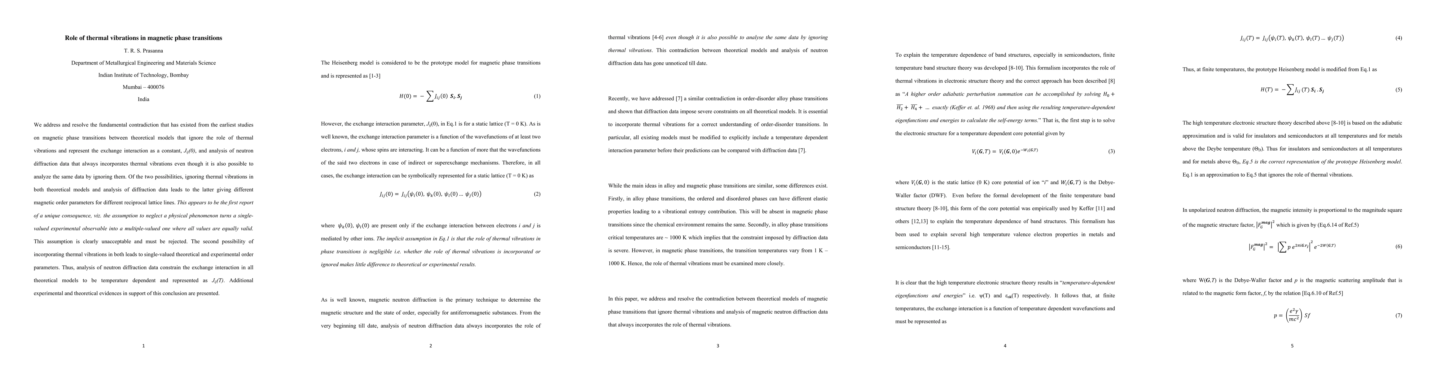 This paper resolves the contradiction between theoretical models and neutron diffraction data regarding magnetic phase transitions by demonstrating that ignoring thermal vibrations leads to inconsistent results, while incorporating them ensures consistent and temperature-dependent exchange interactions.