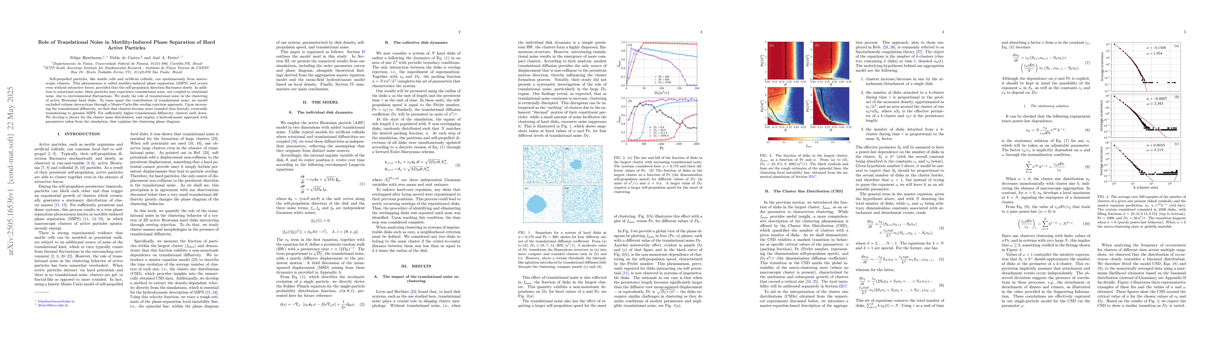 Research investigates how translational noise affects the formation of clusters in motile particles, leading to a phase diagram that explains when clusters form and melt down. Clusters become more rounded with increasing translational diffusivity before eventually melting at higher levels.