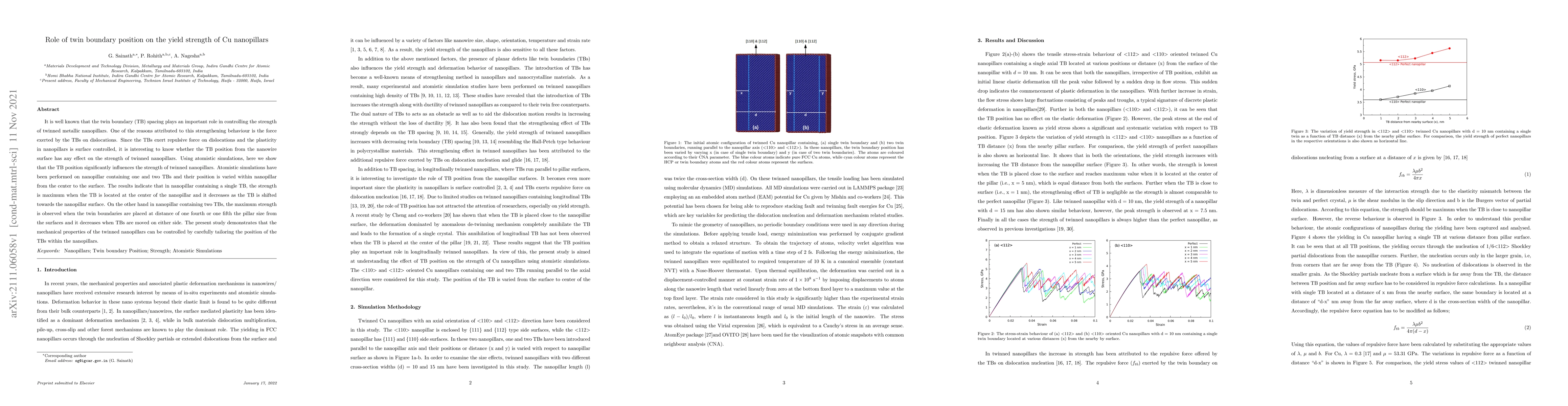 This study reveals that the position of twin boundaries within Cu nanopillars significantly affects their yield strength, with maximum strength observed when twin boundaries are centrally located in single-boundary pillars and at specific distances from the surfaces in dual-boundary pillars. Atomistic simulations demonstrate the potential to control mechanical properties by adjusting twin boundary positions.