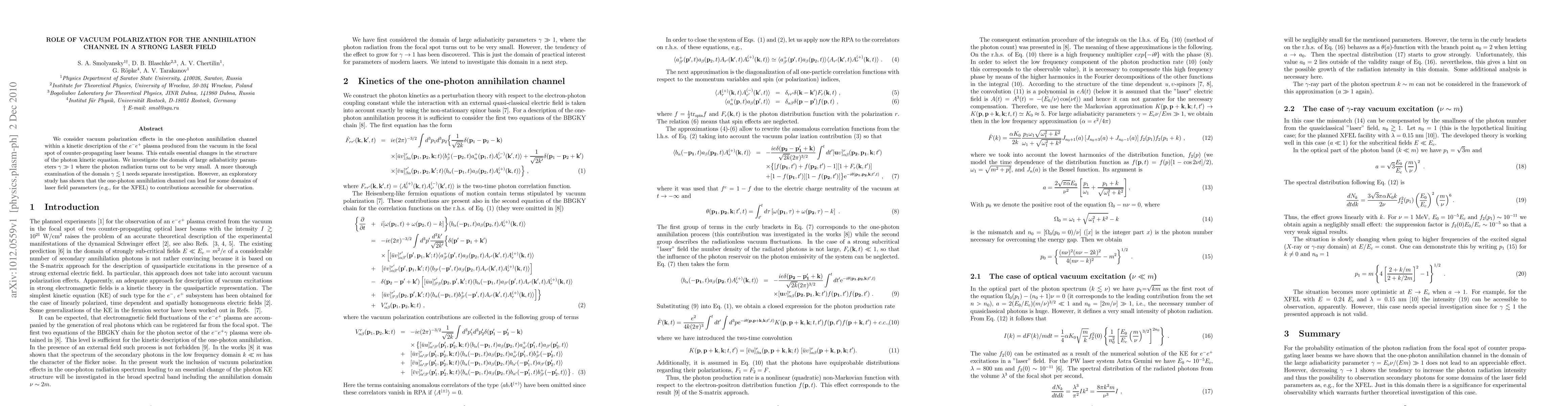 We consider vacuum polarization effects in the one-photon annihilation channel within a kinetic description of the e+ e- plasma produced from the vacuum in the focal spot of counter-propagating laser beams. This entails essential changes in the structure of the photon kinetic equation. We investigate the domain of large adiabaticity parameters gamma >> 1 where the photon radiation turns out to be very small. A more thorough examination of the domain gamma < 1 needs separate investigation. However, an exploratory study has shown that the one-photon annihilation channel can lead for some domains of laser field parameters (e.g., for the XFEL) to contributions accessible for observation.