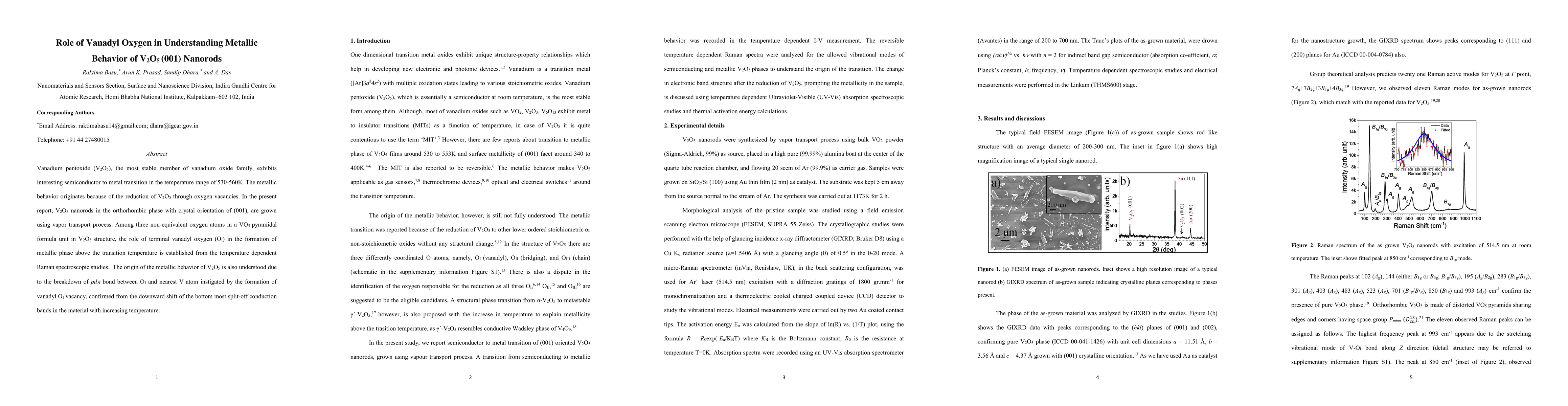 Vanadium pentoxide (V2O5), the most stable member of vanadium oxide family, exhibits interesting semiconductor to metal transition in the temperature range of 530-560 K. The metallic behavior originates because of the reduction of V2O5 through oxygen vacancies. In the present report, V2O5 nanorods in the orthorhombic phase with crystal orientation of (001) are grown using vapor transport process. Among three nonequivalent oxygen atoms in a VO5 pyramidal formula unit in V2O5 structure, the role of terminal vanadyl oxygen (OI) in the formation of metallic phase above the transition temperature is established from the temperature-dependent Raman spectroscopic studies. The origin of the metallic behavior of V2O5 is also understood due to the breakdown of pdpi bond between OI and nearest V atom instigated by the formation of vanadyl OI vacancy, confirmed from the downward shift of the bottom most split-off conduction bands in the material with increasing temperature.