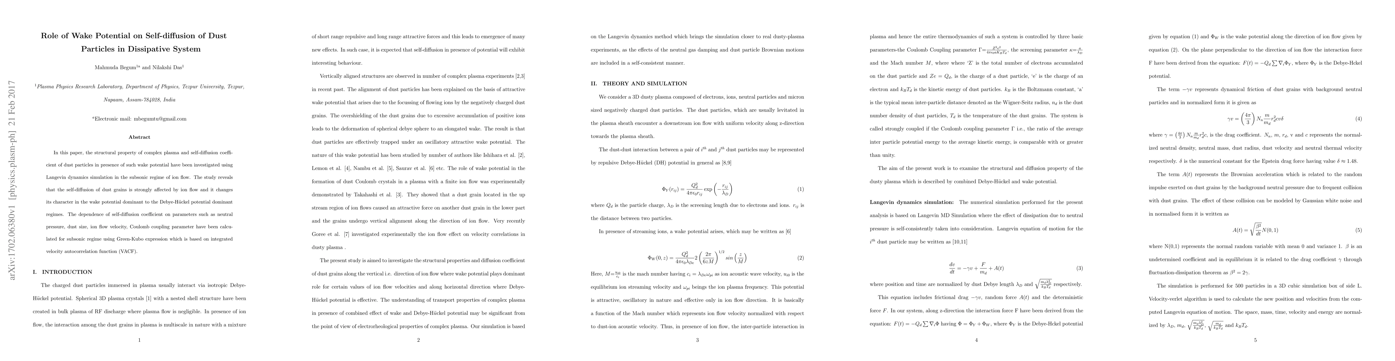 In this paper, the structural property of complex plasma and self-diffusion coefficient of dust particles in presence of such wake potential have been investigated using Langevin dynamics simulation in the subsonic regime of ion flow. The study reveals that the self-diffusion of dust grains is strongly affected by ion flow and it changes its character in the wake potential dominant to the Debye-H\"uckel potential dominant regimes. The dependence of self-diffusion coefficient on parameters such as neutral pressure, dust size, ion flow velocity, Coulomb coupling parameter have been calculated for subsonic regime using Green-Kubo expression which is based on integrated velocity autocorrelation function (VACF).