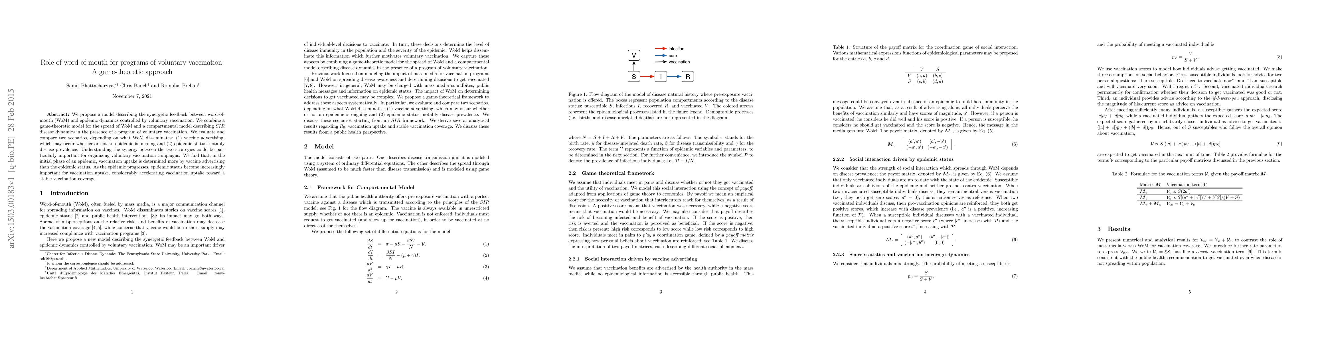 We propose a model describing the synergetic feedback between word-of-mouth (WoM) and epidemic dynamics controlled by voluntary vaccination. We combine a game-theoretic model for the spread of WoM and a compartmental model describing $SIR$ disease dynamics in the presence of a program of voluntary vaccination. We evaluate and compare two scenarios, depending on what WoM disseminates: (1) vaccine advertising, which may occur whether or not an epidemic is ongoing and (2) epidemic status, notably disease prevalence. Understanding the synergy between the two strategies could be particularly important for organizing voluntary vaccination campaigns. We find that, in the initial phase of an epidemic, vaccination uptake is determined more by vaccine advertising than the epidemic status. As the epidemic progresses, epidemic status become increasingly important for vaccination uptake, considerably accelerating vaccination uptake toward a stable vaccination coverage.