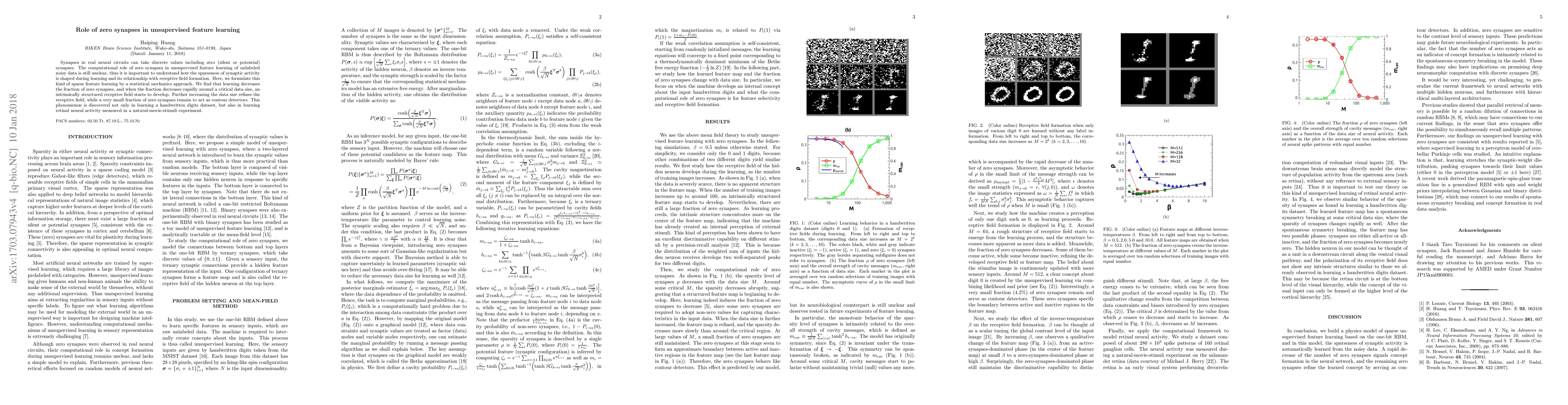 This paper investigates how zero synapses contribute to unsupervised feature learning in neural circuits, finding that a decrease in zero synapses correlates with the development of structured receptive fields. As data size increases, the receptive field refines, maintaining a small fraction of zero synapses that function as contour detectors.