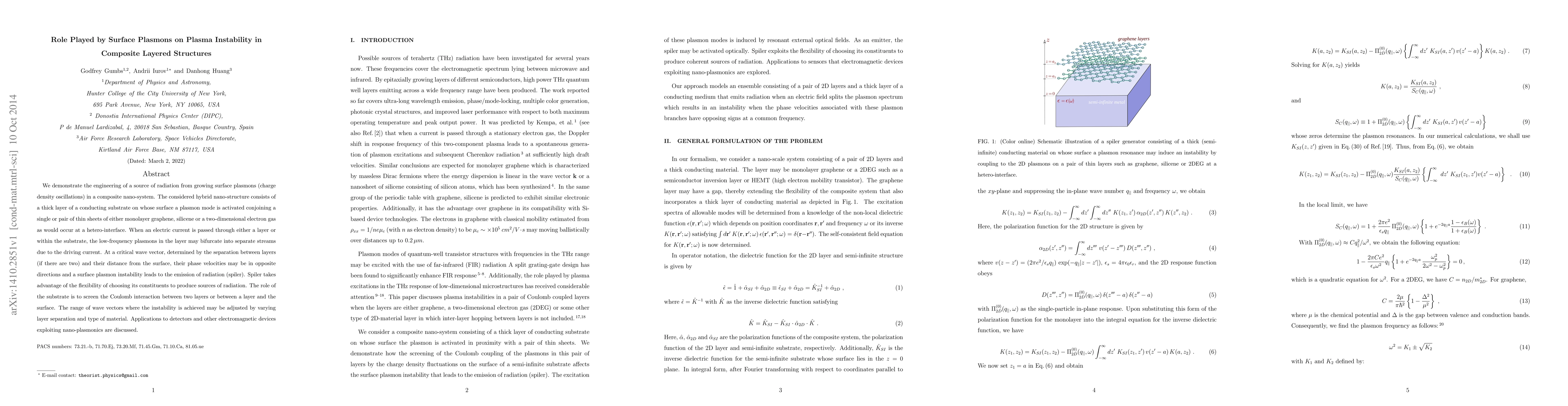 We demonstrate the engineering of a source of radiation from growing surface plasmons (charge density oscillations) in a composite nano-system. The considered hybrid nano-structure consists of a thick layer of a conducting substrate on whose surface a plasmon mode is activated conjoining a single or pair of thin sheets of either monolayer graphene, silicene or a two-dimensional electron gas as would occur at a hetero-interface. When an electric current is passed through either a layer or within the substrate, the low-frequency plasmons in the layer may bifurcate into separate streams due to the driving current. At a critical wave vector, determined by the separation between layers (if there are two) and their distance from the surface, their phase velocities may be in opposite directions and a surface plasmon instability leads to the emission of radiation (spiler). Spiler takes advantage of the flexibility of choosing its constituents to produce sources of radiation. The role of the substrate is to screen the Coulomb interaction between two layers or between a layer and the surface. The range of wave vectors where the instability is achieved may be adjusted by varying layer separation and type of material. Applications to detectors and other electromagnetic devices exploiting nano-plasmonics are discussed.