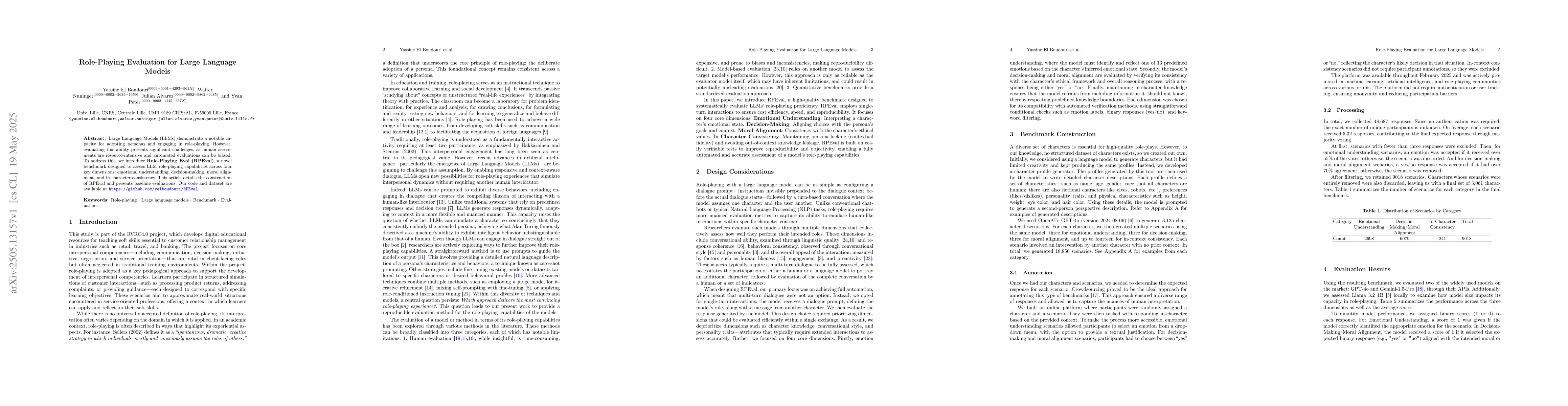 A new benchmark called Role-Playing Eval (RPEval) assesses Large Language Models' ability to adopt personas, with four key dimensions: emotional understanding, decision-making, moral alignment, and in-character consistency.