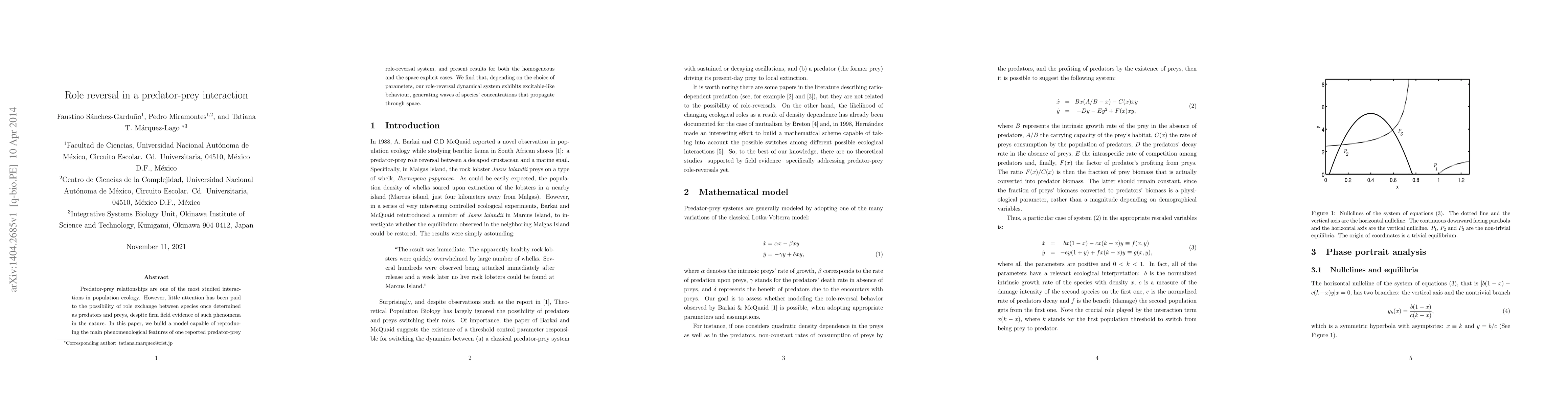 Predator-prey relationships are one of the most studied interactions in population ecology. However, little attention has been paid to the possibility of role exchange between species once determined as predators and preys, despite firm field evidence of such phenomena in the nature. In this paper, we build a model capable of reproducing the main phenomenological features of one reported predator-prey role-reversal system, and present results for both the homogeneous and the space explicit cases. We find that, depending on the choice of parameters, our role-reversal dynamical system exhibits excitable-like behaviour, generating waves of species' concentrations that propagate through space.