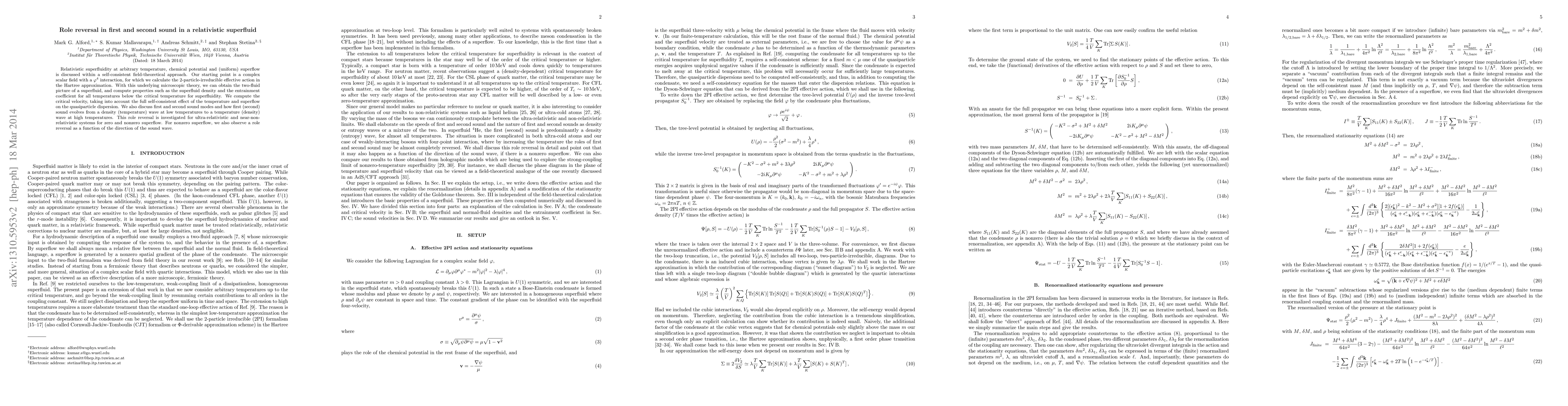 Relativistic superfluidity at arbitrary temperature, chemical potential and (uniform) superflow is discussed within a self-consistent field-theoretical approach. Our starting point is a complex scalar field with a $\varphi^4$ interaction, for which we calculate the 2-particle-irreducible effective action in the Hartree approximation. With this underlying microscopic theory, we can obtain the two-fluid picture of a superfluid, and compute properties such as the superfluid density and the entrainment coefficient for all temperatures below the critical temperature for superfluidity. We compute the critical velocity, taking into account the full self-consistent effect of the temperature and superflow on the quasiparticle dispersion. We also discuss first and second sound modes and how first (second) sound evolves from a density (temperature) wave at low temperatures to a temperature (density) wave at high temperatures. This role reversal is investigated for ultra-relativistic and near-non-relativistic systems for zero and nonzero superflow. For nonzero superflow, we also observe a role reversal as a function of the direction of the sound wave.