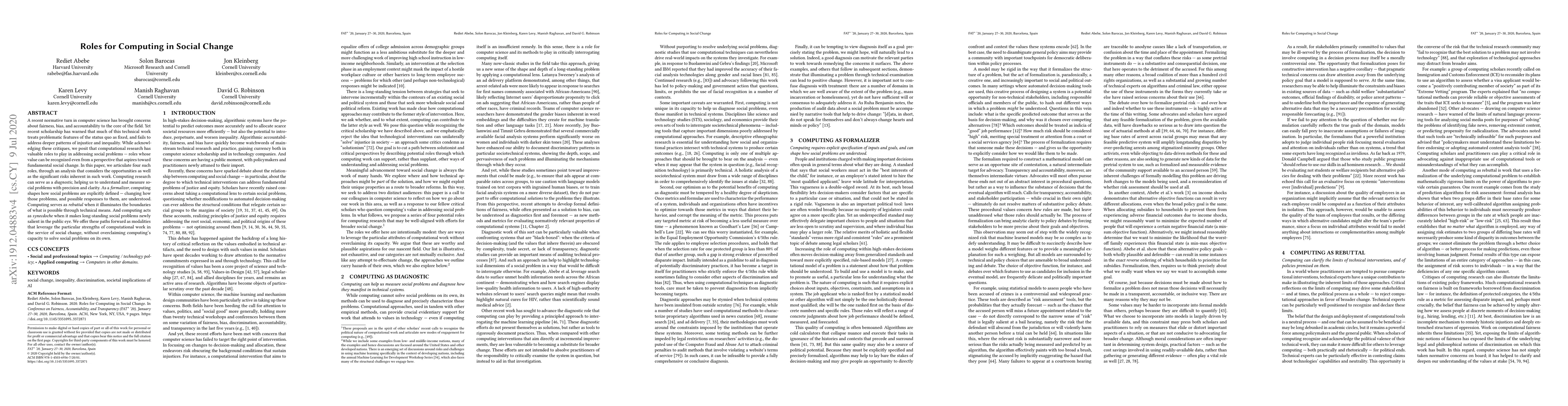 A recent normative turn in computer science has brought concerns about fairness, bias, and accountability to the core of the field. Yet recent scholarship has warned that much of this technical work treats problematic features of the status quo as fixed, and fails to address deeper patterns of injustice and inequality. While acknowledging these critiques, we posit that computational research has valuable roles to play in addressing social problems -- roles whose value can be recognized even from a perspective that aspires toward fundamental social change. In this paper, we articulate four such roles, through an analysis that considers the opportunities as well as the significant risks inherent in such work. Computing research can serve as a diagnostic, helping us to understand and measure social problems with precision and clarity. As a formalizer, computing shapes how social problems are explicitly defined --- changing how those problems, and possible responses to them, are understood. Computing serves as rebuttal when it illuminates the boundaries of what is possible through technical means. And computing acts as synecdoche when it makes long-standing social problems newly salient in the public eye. We offer these paths forward as modalities that leverage the particular strengths of computational work in the service of social change, without overclaiming computing's capacity to solve social problems on its own.