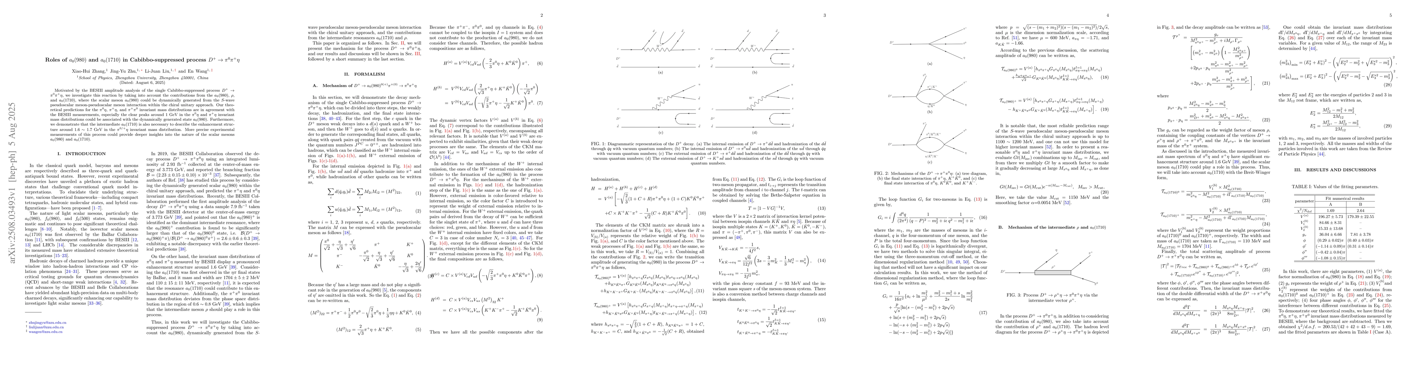 The study presents a detailed theoretical analysis of the $D^+\to π^0π^+η$ process, incorporating the chiral unitary approach to dynamically generate scalar mesons $a_0(980)$ and $a_0(1710)$, and comparing predictions with BESIII measurements.